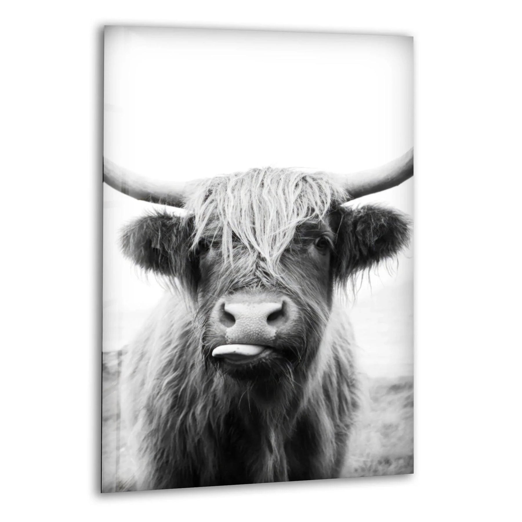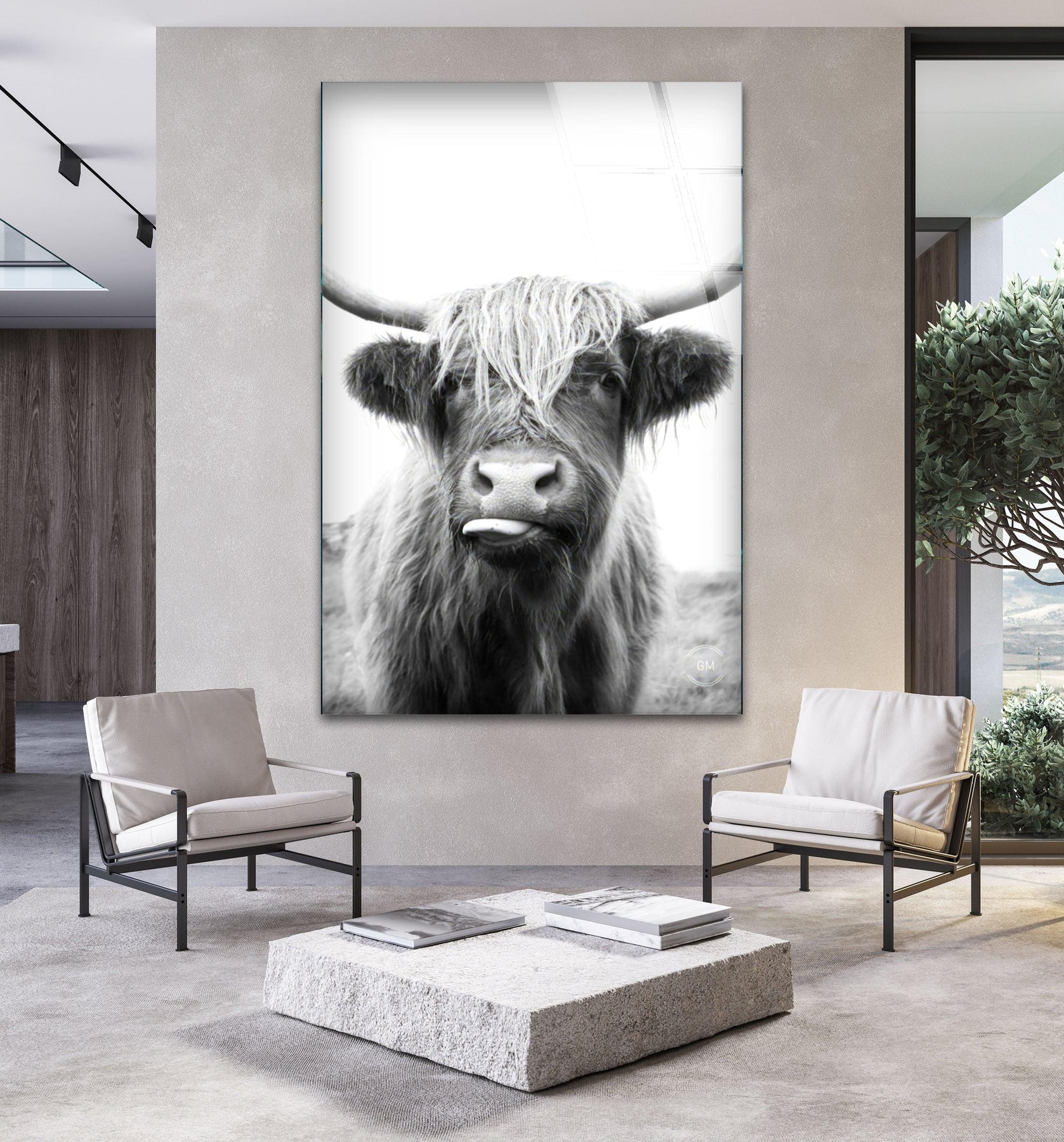 Black and white glass wall art featuring a Highland cow with shaggy fur and long horns staring directly forward.