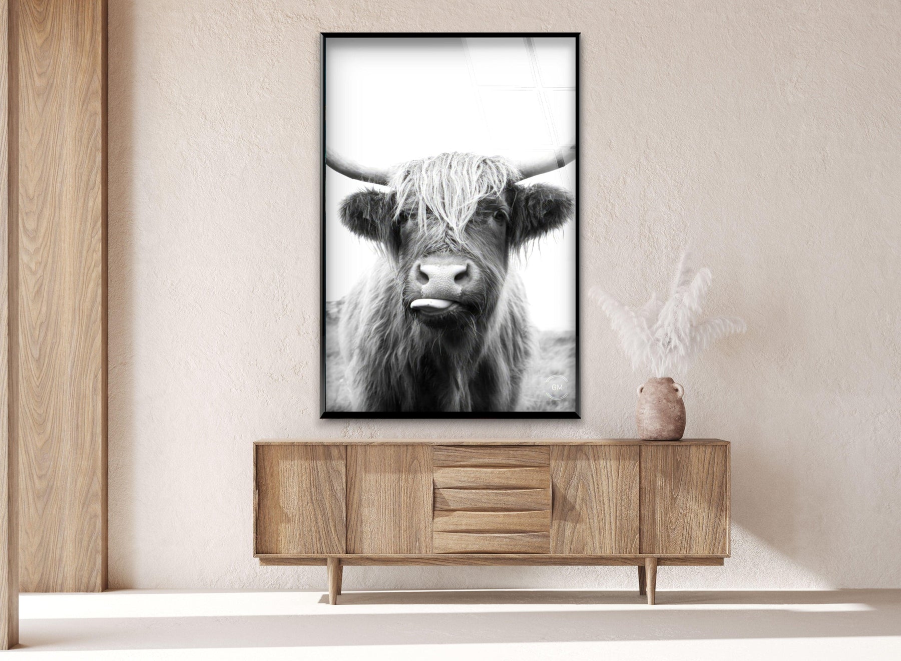 Close-up black and white Highland cow printed on glass with natural details and rustic charm.