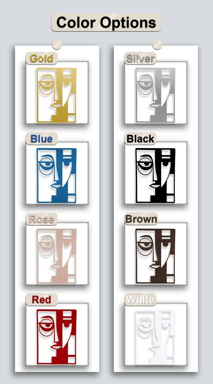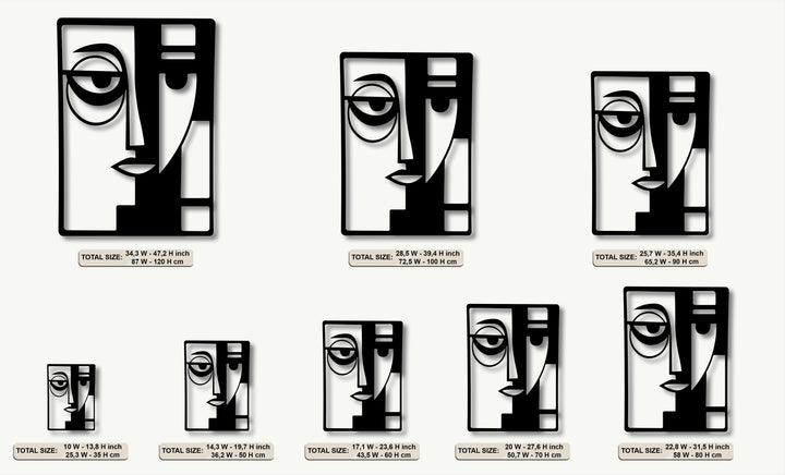 A vertically oriented rectangular metal art for wall depicts an abstract dual face with modern geometric shapes.