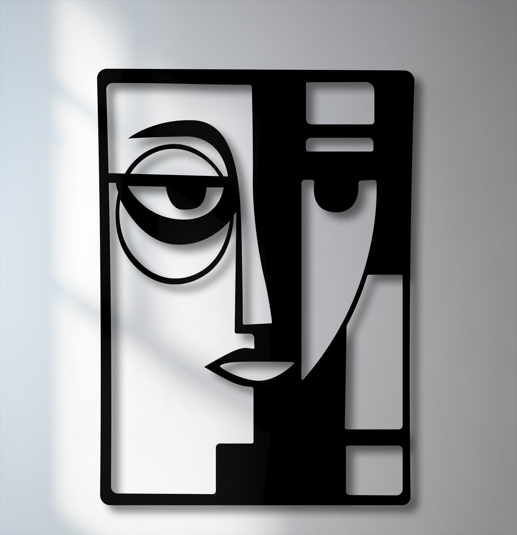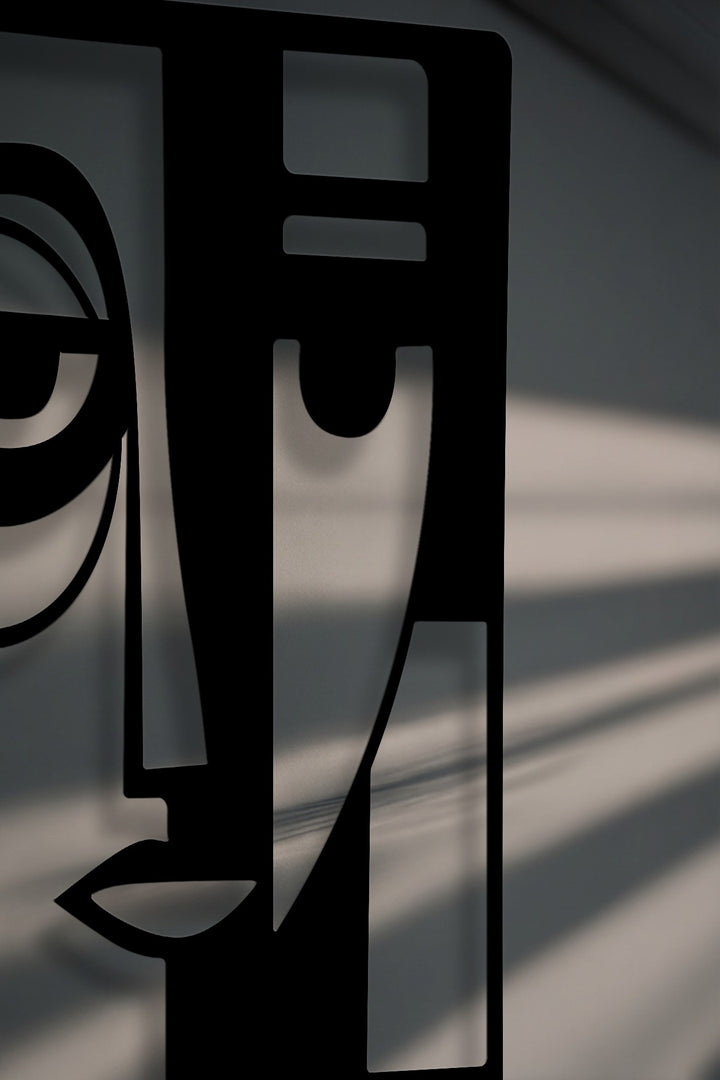 The darkest area reveals a striking, geometric abstraction of a dual face, forming a captivating modern metal wall decor piece.
