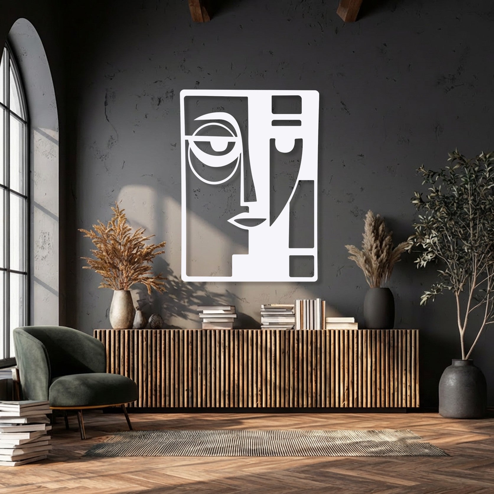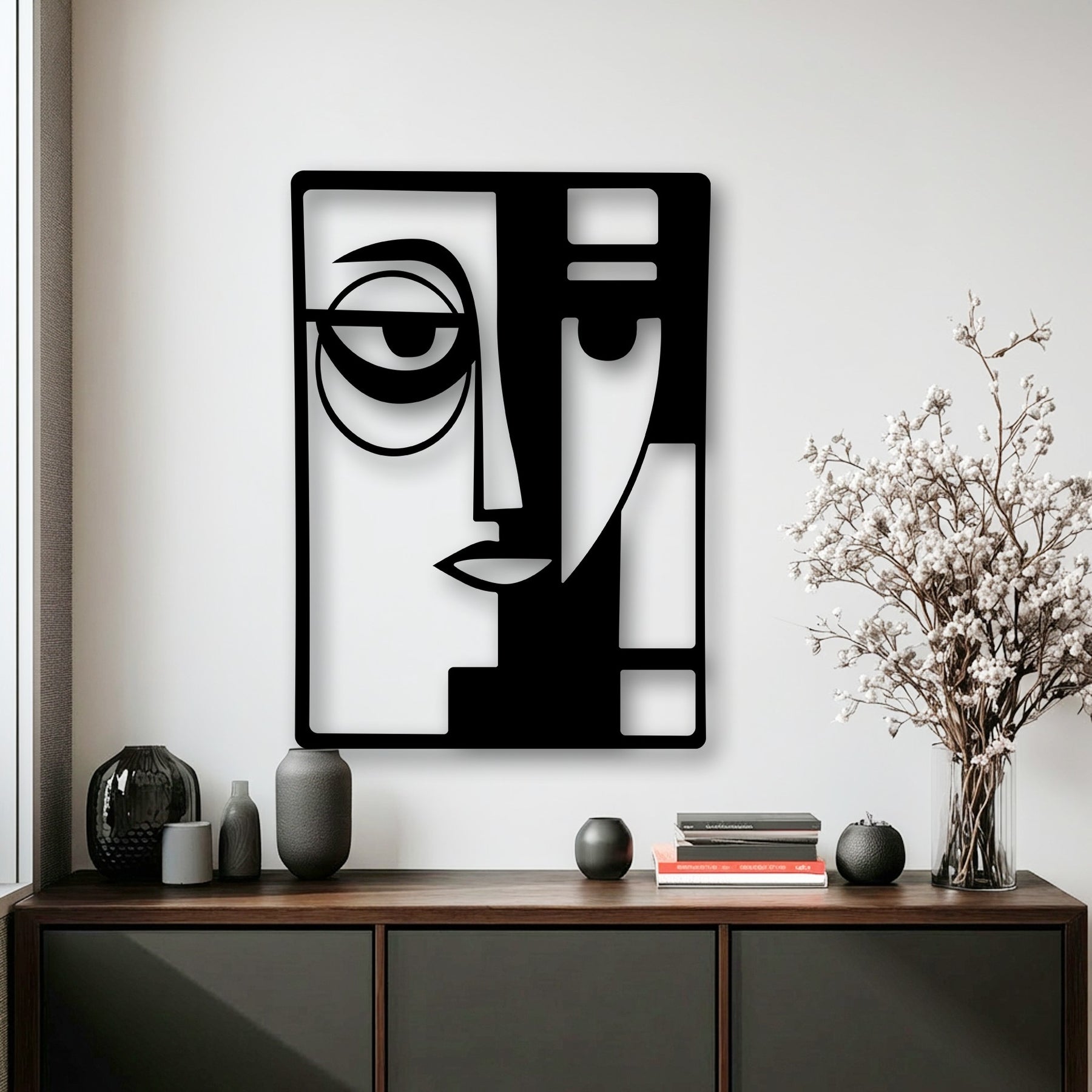 The darkest area, a sleek black metal decoration wall art, displays an abstract dual face with bold, geometric lines.