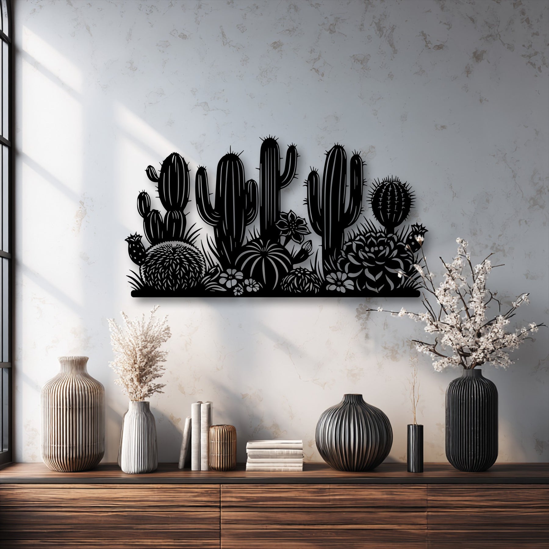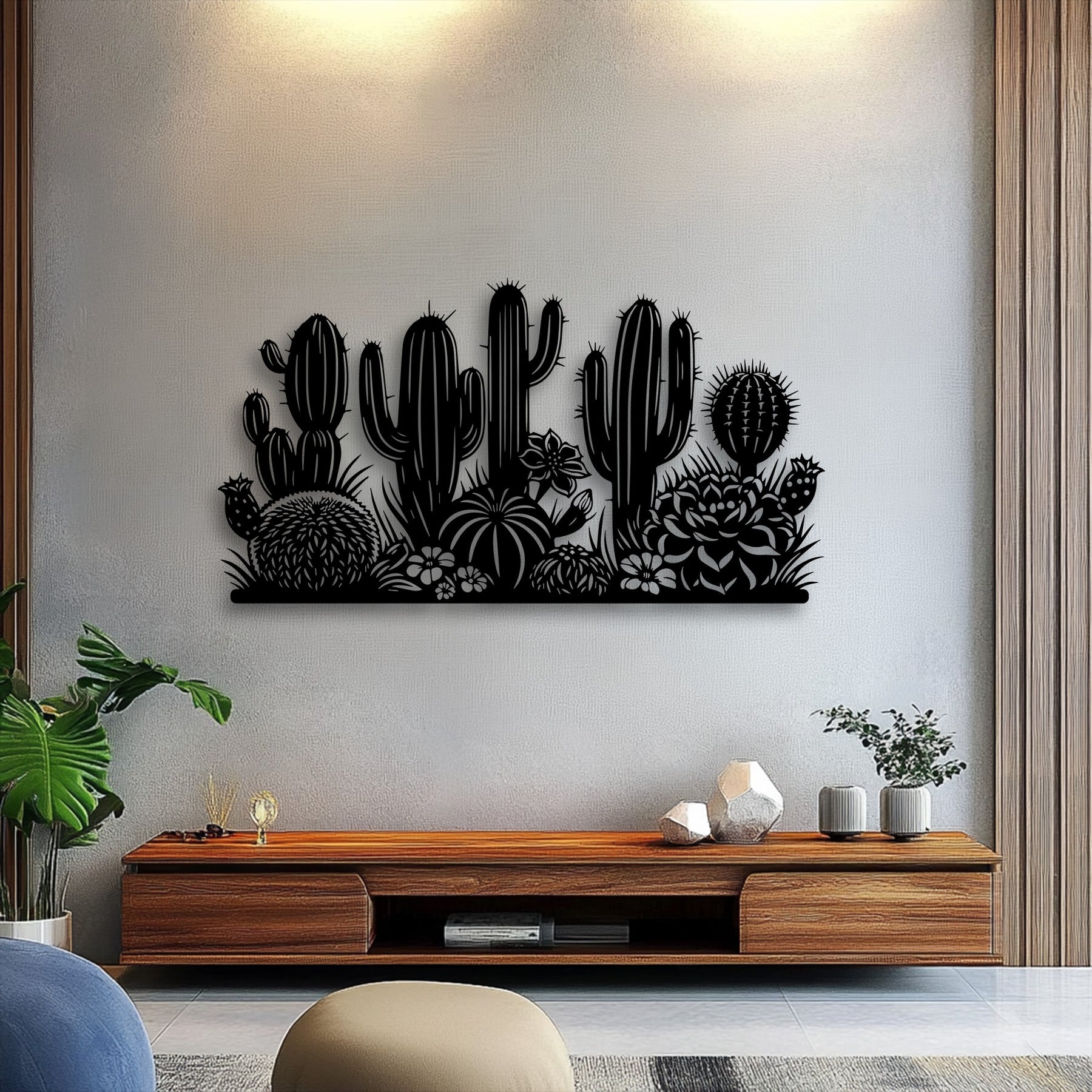 A calm and inviting mood fills the space, highlighted by the intricate desert cactus garden silhouette metal artwork.