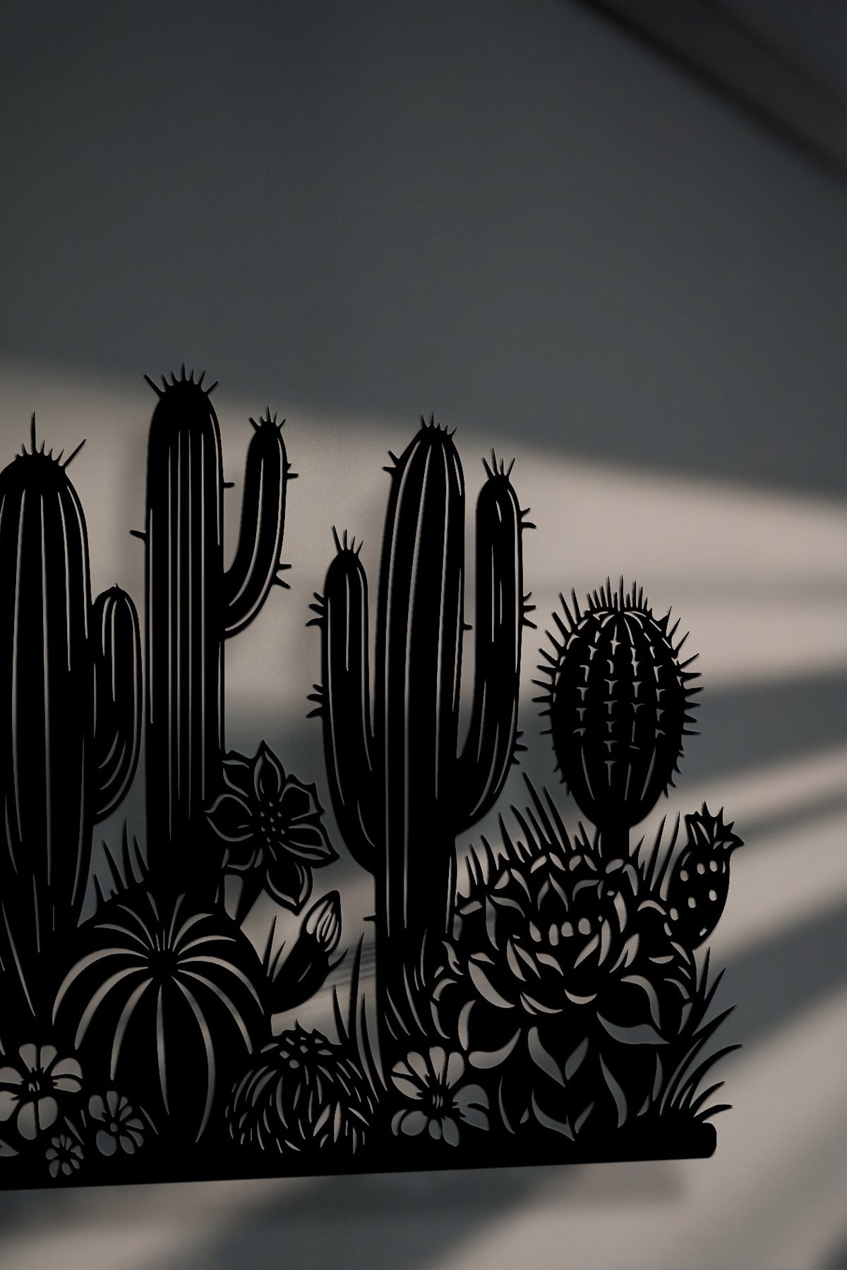 Highlighting the layering effect, this decorative metal art of a desert cactus garden silhouette casts deep shadows, enhancing its unique visual depth.