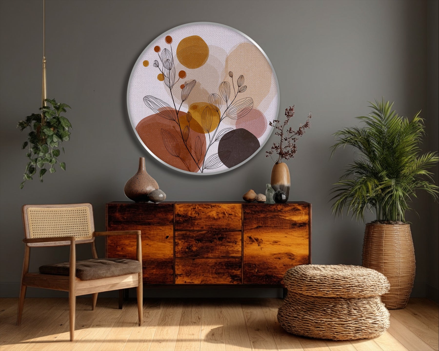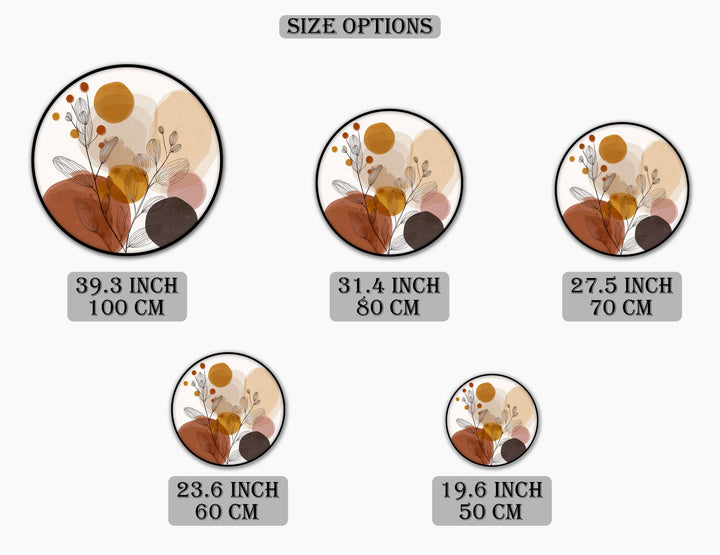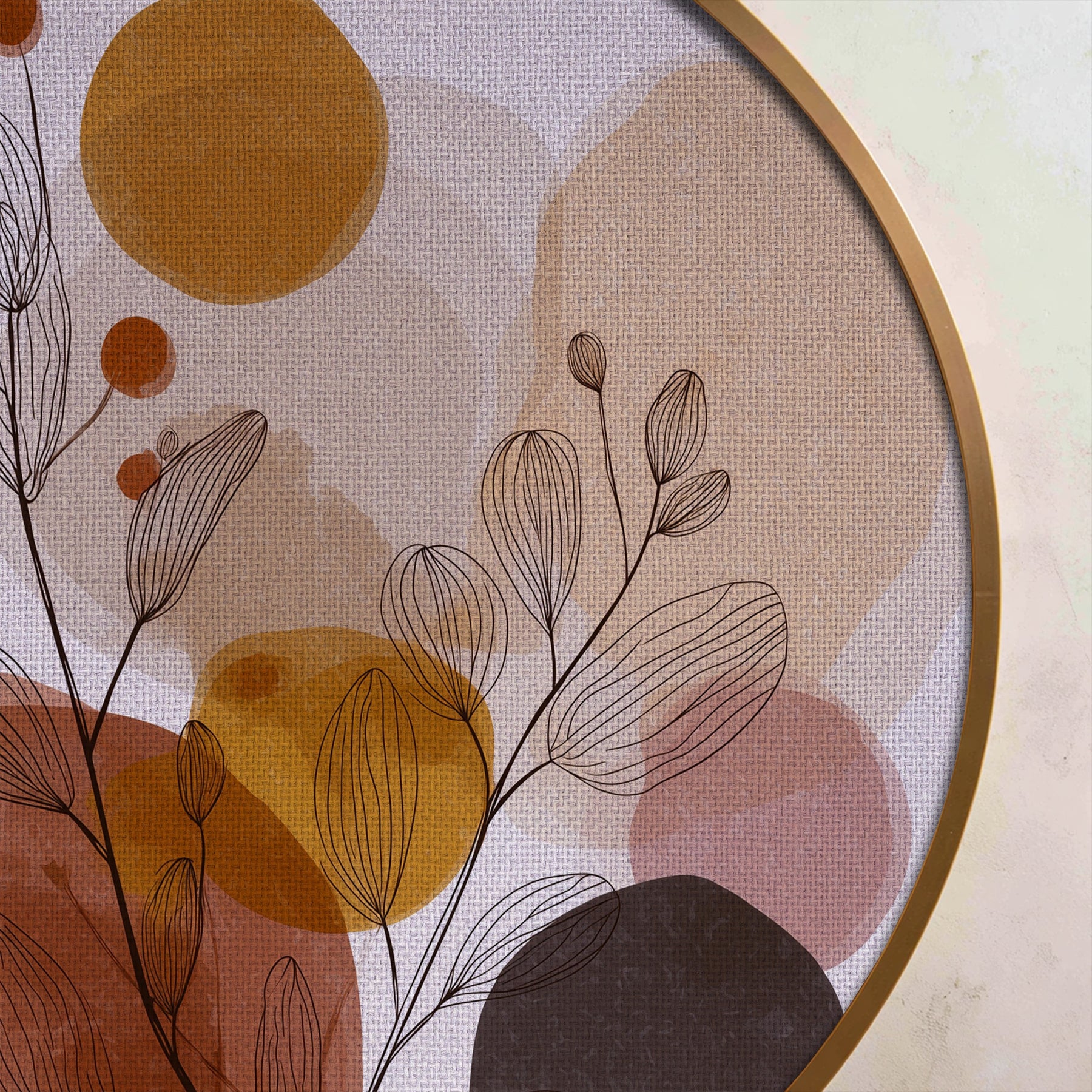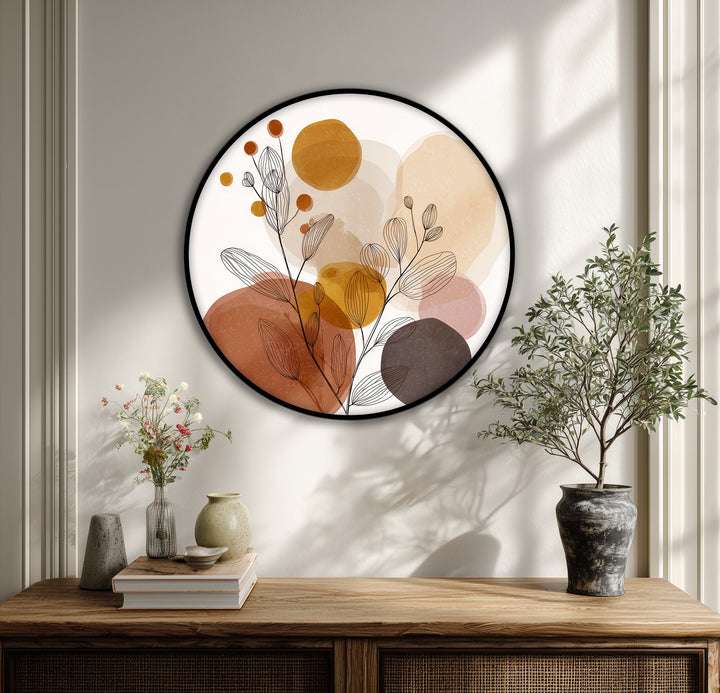 Soft, organic, and effortlessly stylish, this round canvas print blends delicate botanical line art with layered abstract shapes in warm earthy tones. Flowing leaf outlines intertwine with muted circles and forms in shades of terracotta, beige, ochre, and soft brown—creating a calm and contemporary composition.
