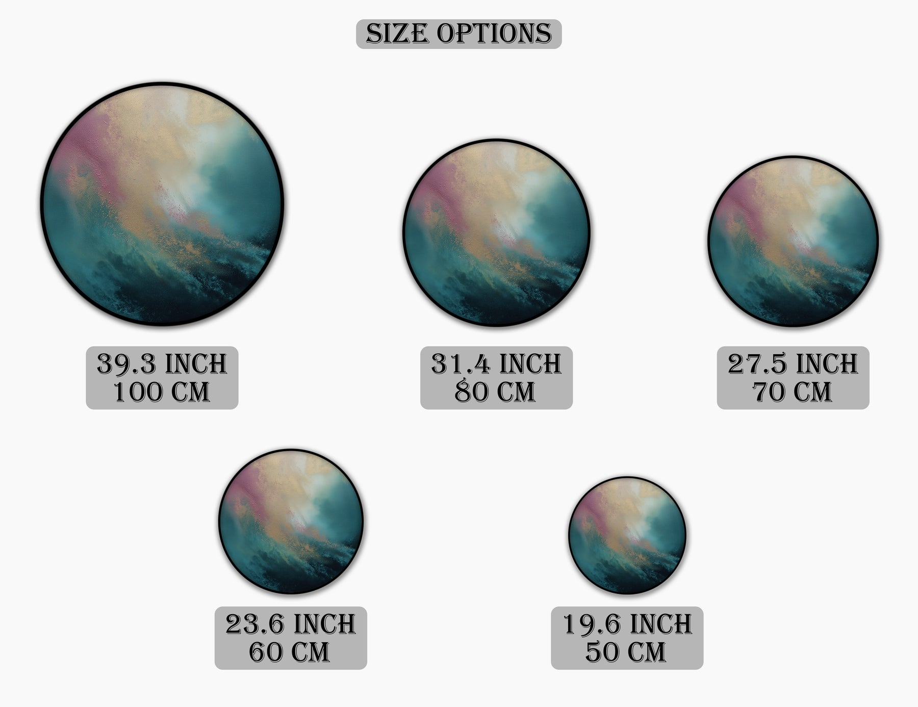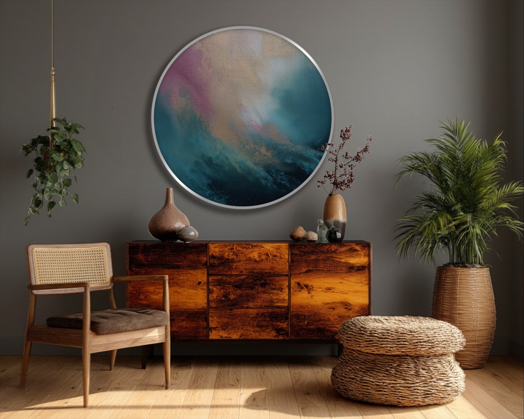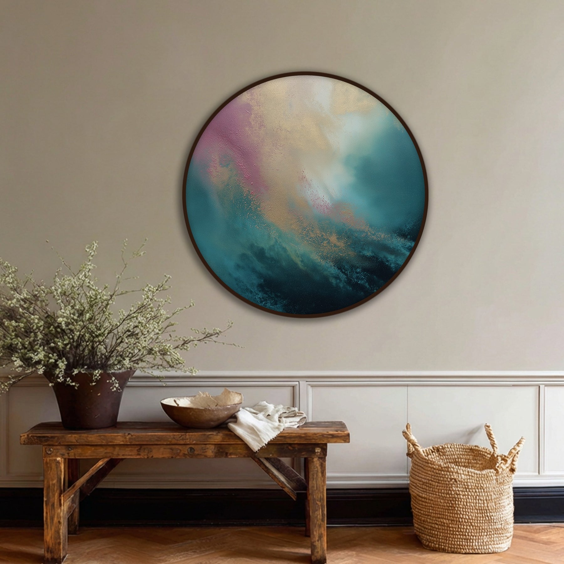 Immerse your space in a soft, atmospheric blend of color and light. This round canvas print features a dreamy abstract composition where deep teal tones merge with gentle blush pinks and shimmering gold accents. The fluid transitions and mist-like textures create a sense of depth and calm, evoking the feeling of a distant horizon or a fading sunset over tranquil waters.