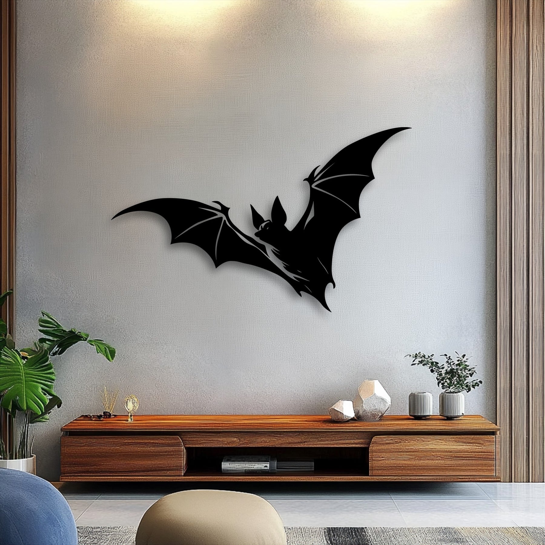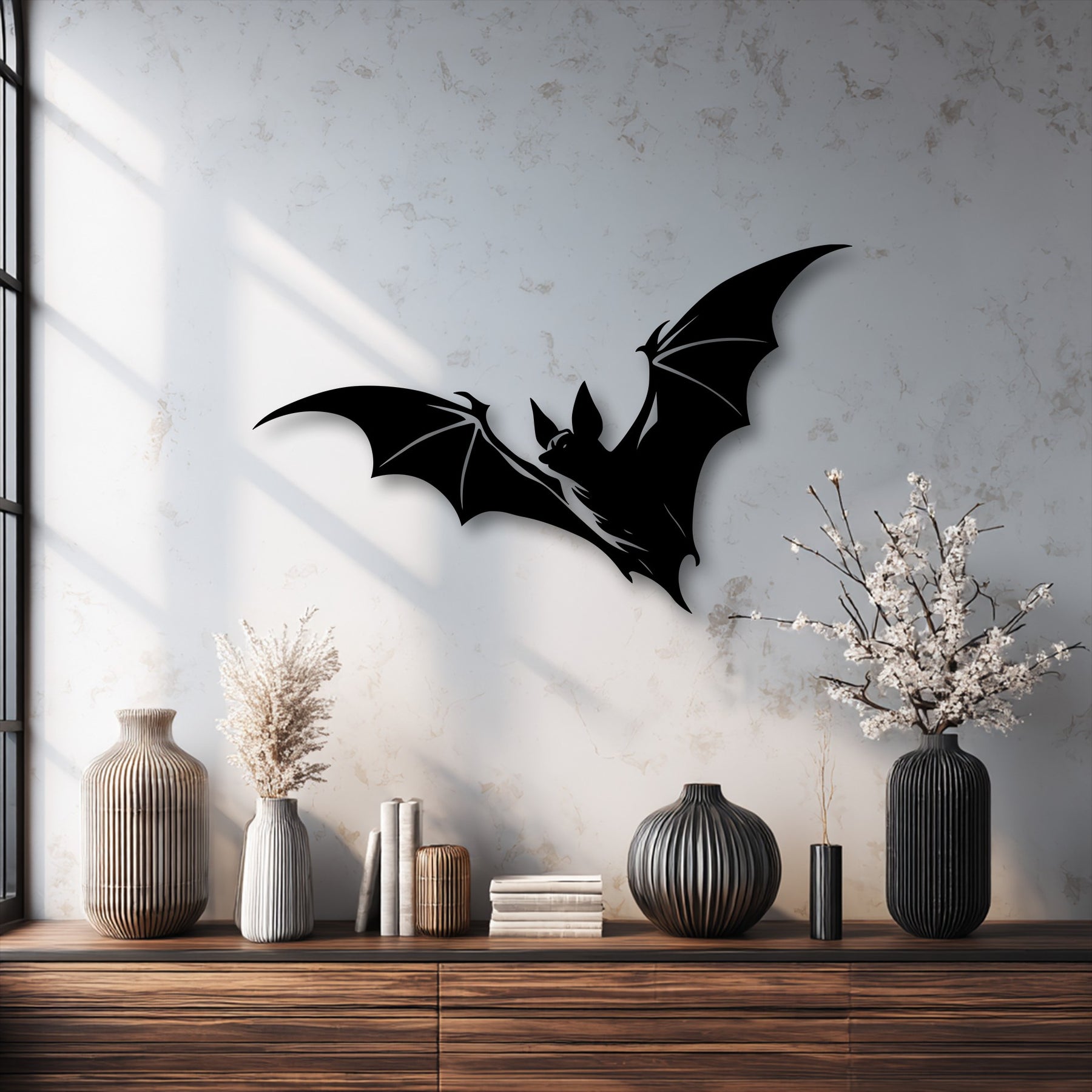 Dark decorative vases, stacked books, and white flowers on a wooden credenza complement the striking flying bat metal wall decor.