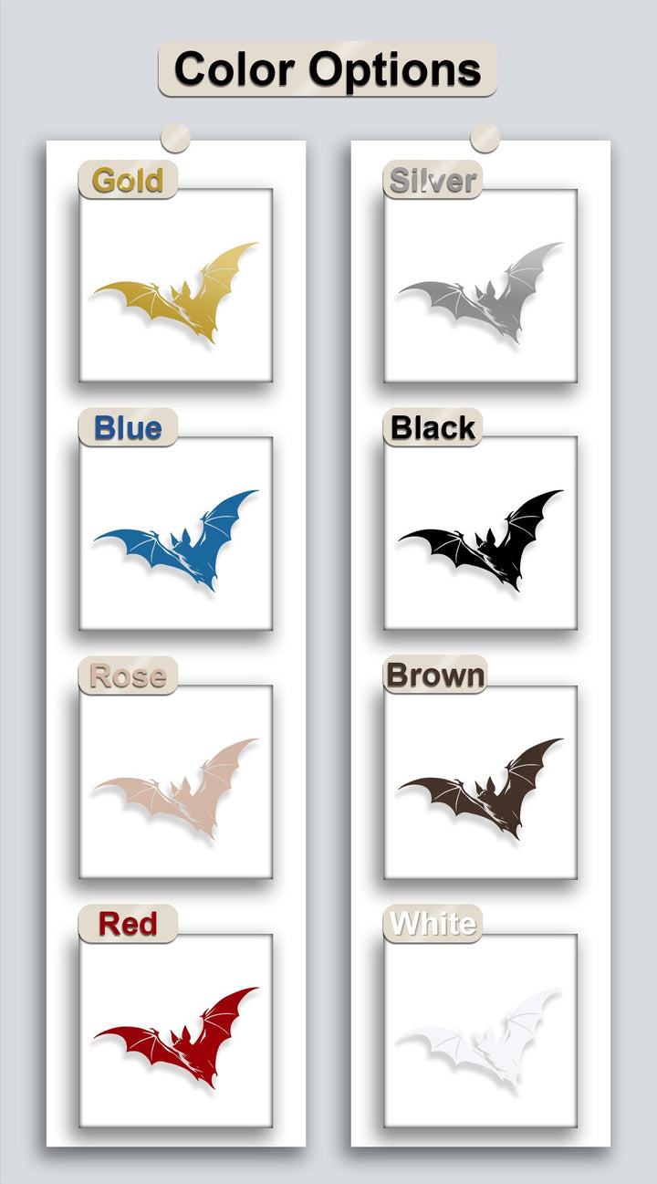 A prominent dark silhouette of a flying bat, featuring textured wings and pointed ears, stands out as a unique piece of decorative metal art.