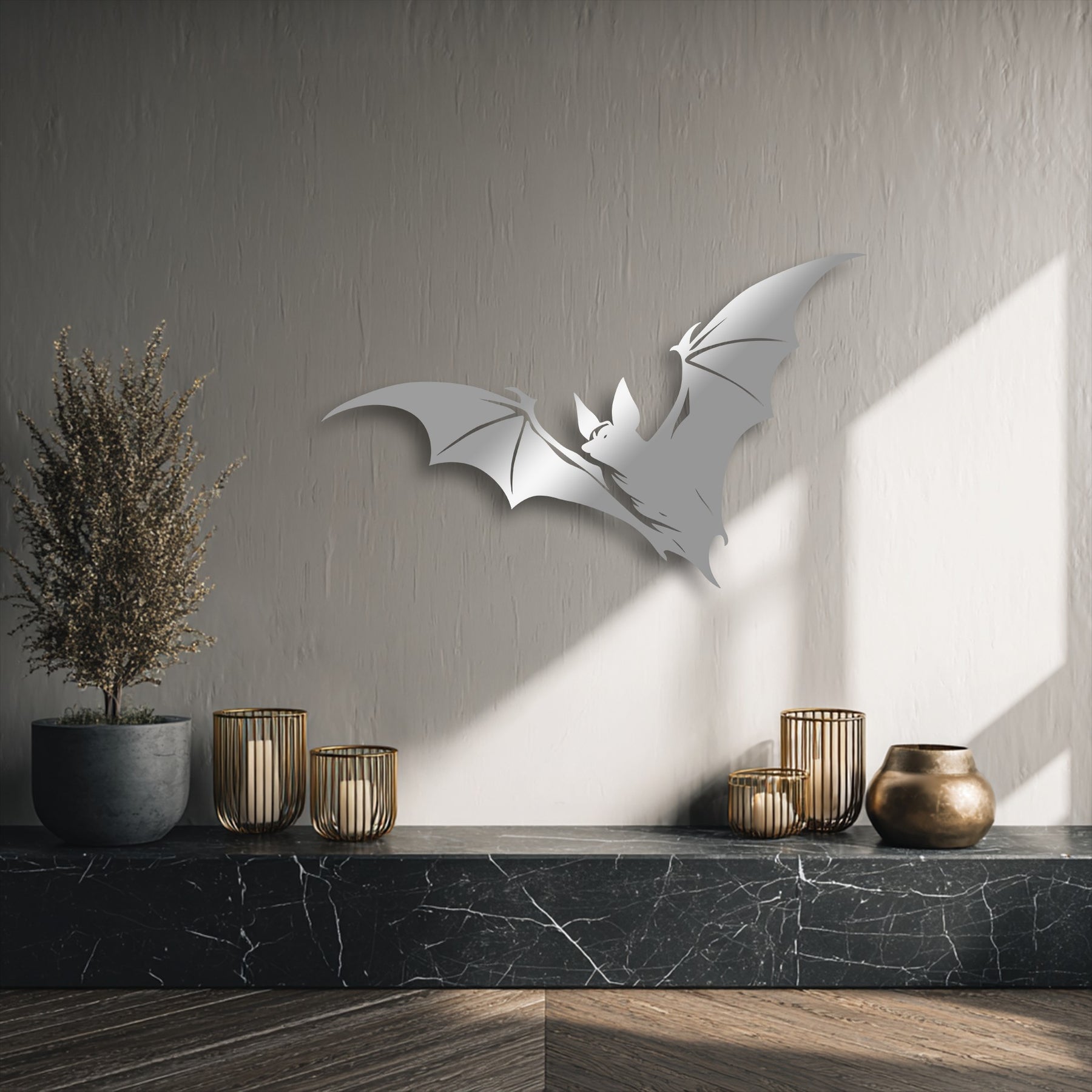 The bold silver flying bat silhouette metal wall decor loudly stands out against the textured gray wall, illuminated by bright natural light.