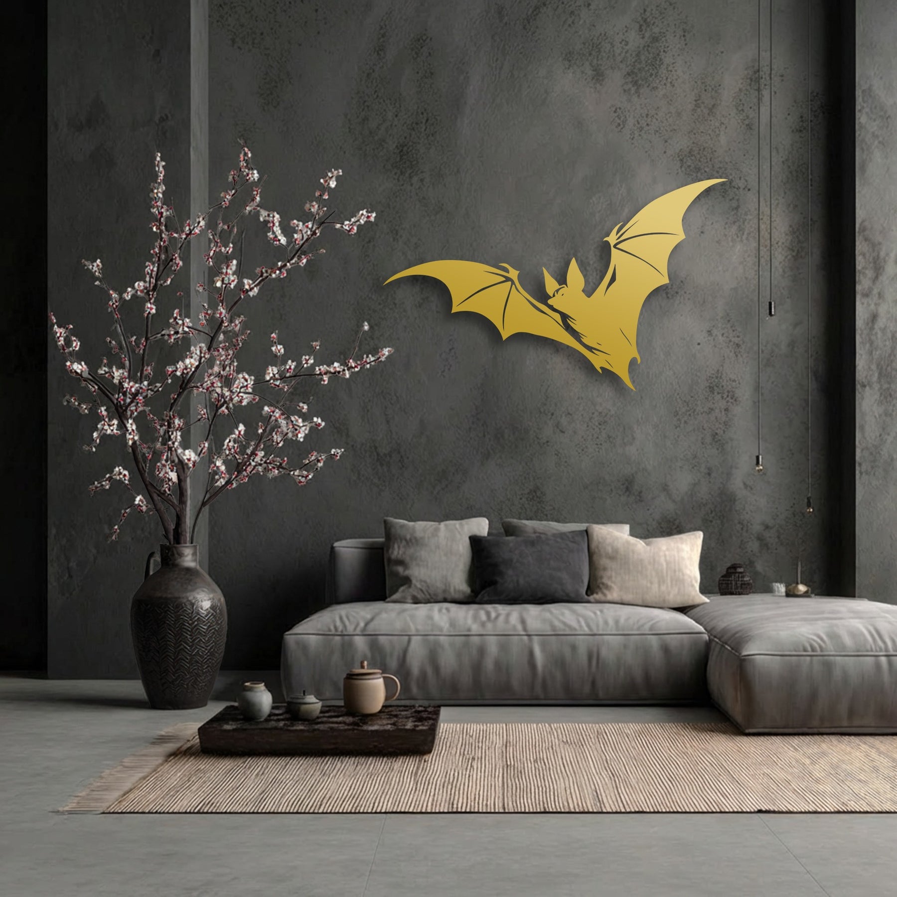 The negative space around the gold flying bat silhouette on the dark textured wall highlights this decorative metal art piece above a minimalist couch.