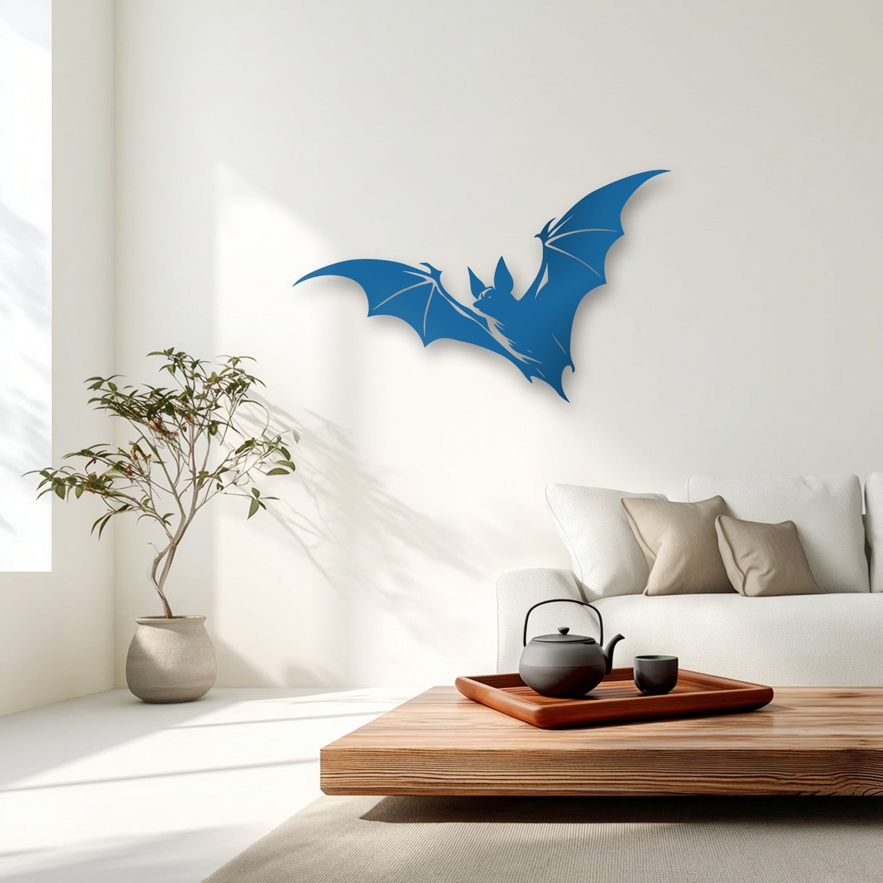 The azure bat decorative metal art creates a striking layering effect against the bright white wall, casting a subtle shadow.