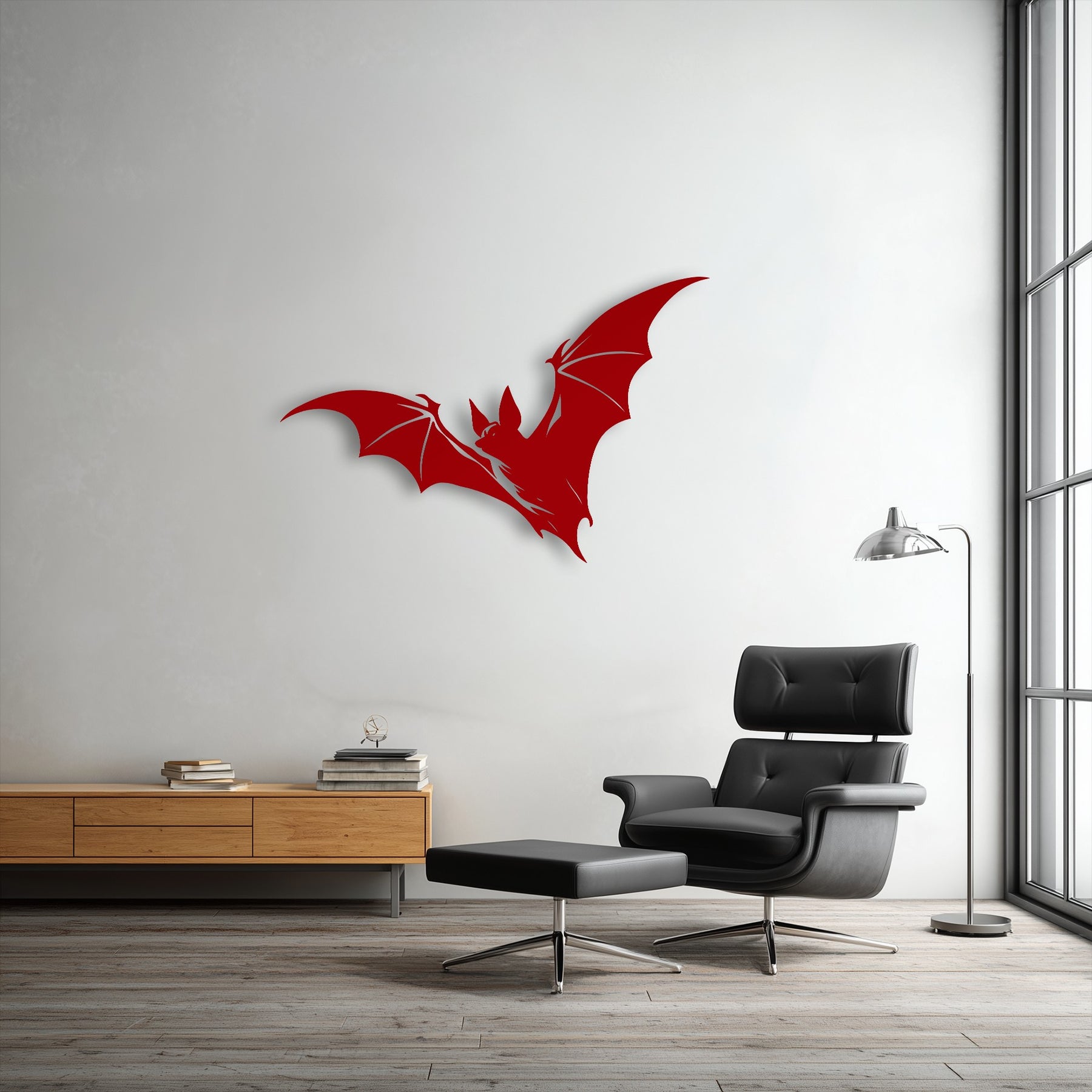 A striking red flying bat metal decoration wall art dramatically captures dynamic motion against a minimalist white wall.