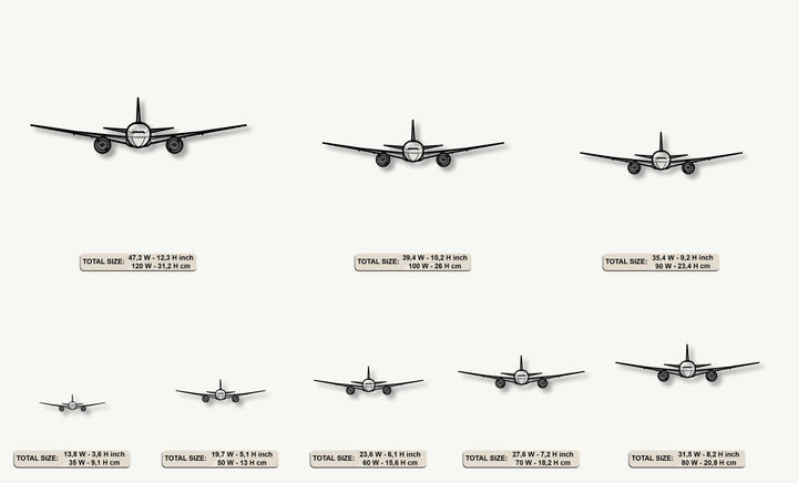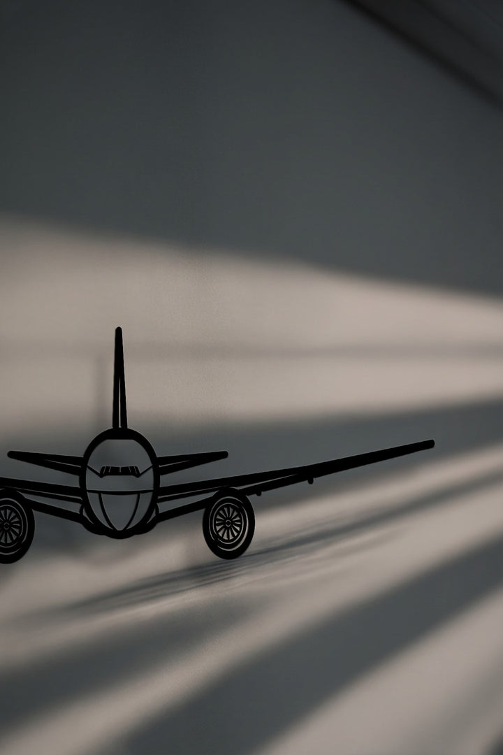 A bold front view airplane silhouette, as striking aviation metal art for wall, stands out against a softly shadowed background.