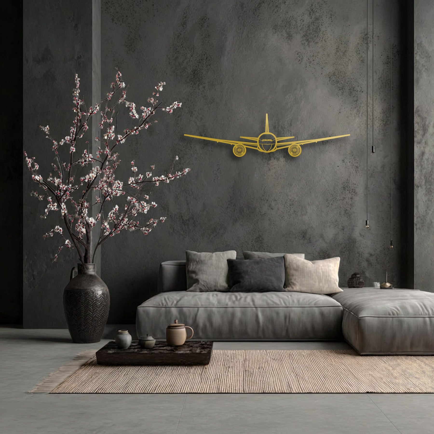 With low color saturation, a unique metal wall art airplane silhouette adorns a textured dark grey wall above a minimalist sofa.