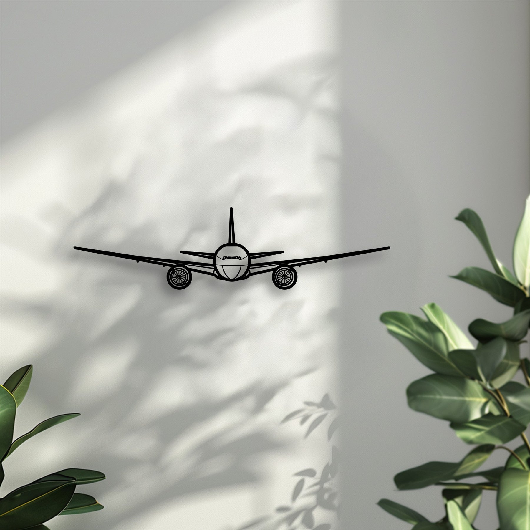 The bold airplane silhouette, a captivating piece of metal art for wall, dominates the subtly shadowed light gray wall.