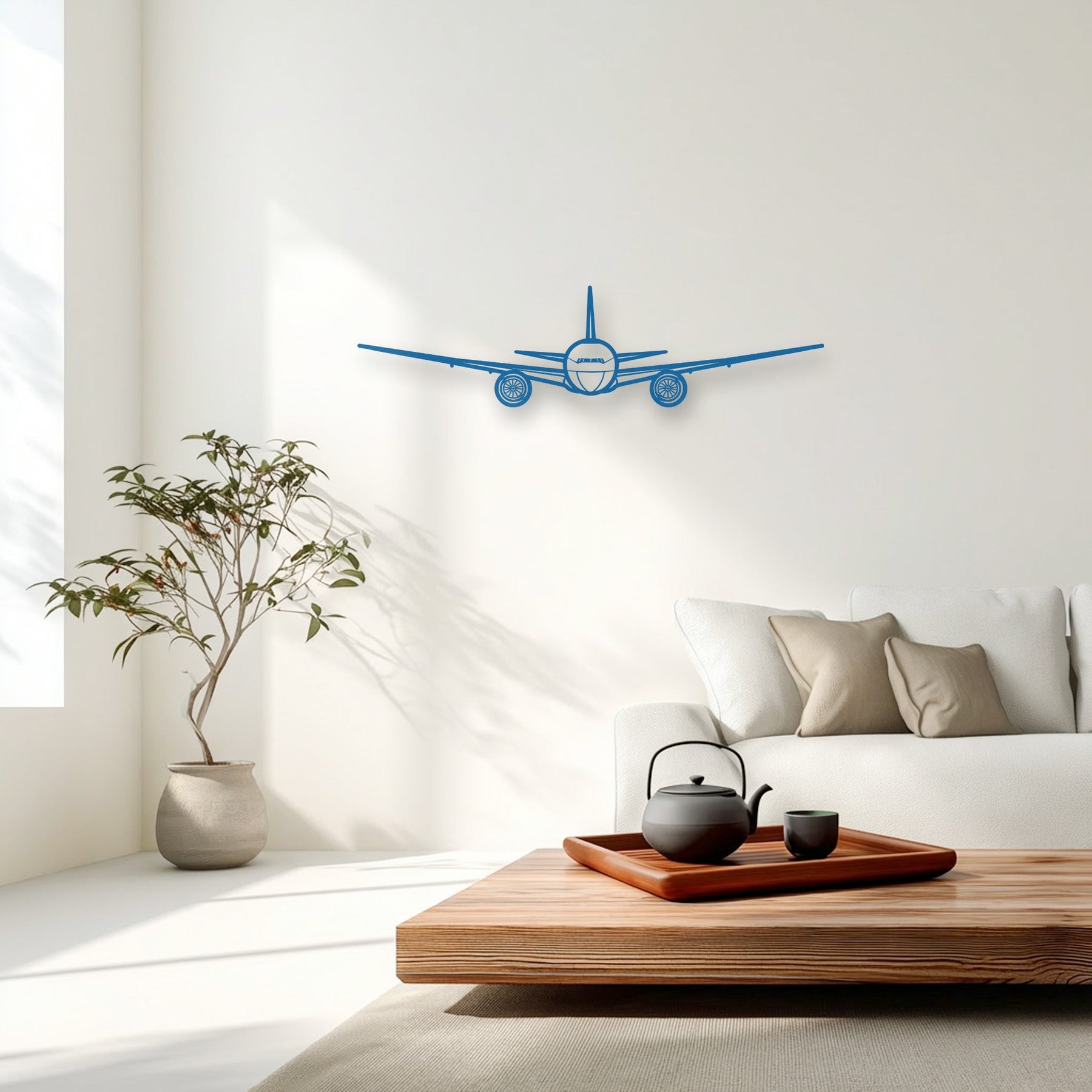 A clean white background wall, bathed in natural sunlight and subtle shadows, perfectly showcases the blue aviation metal decoration wall art.