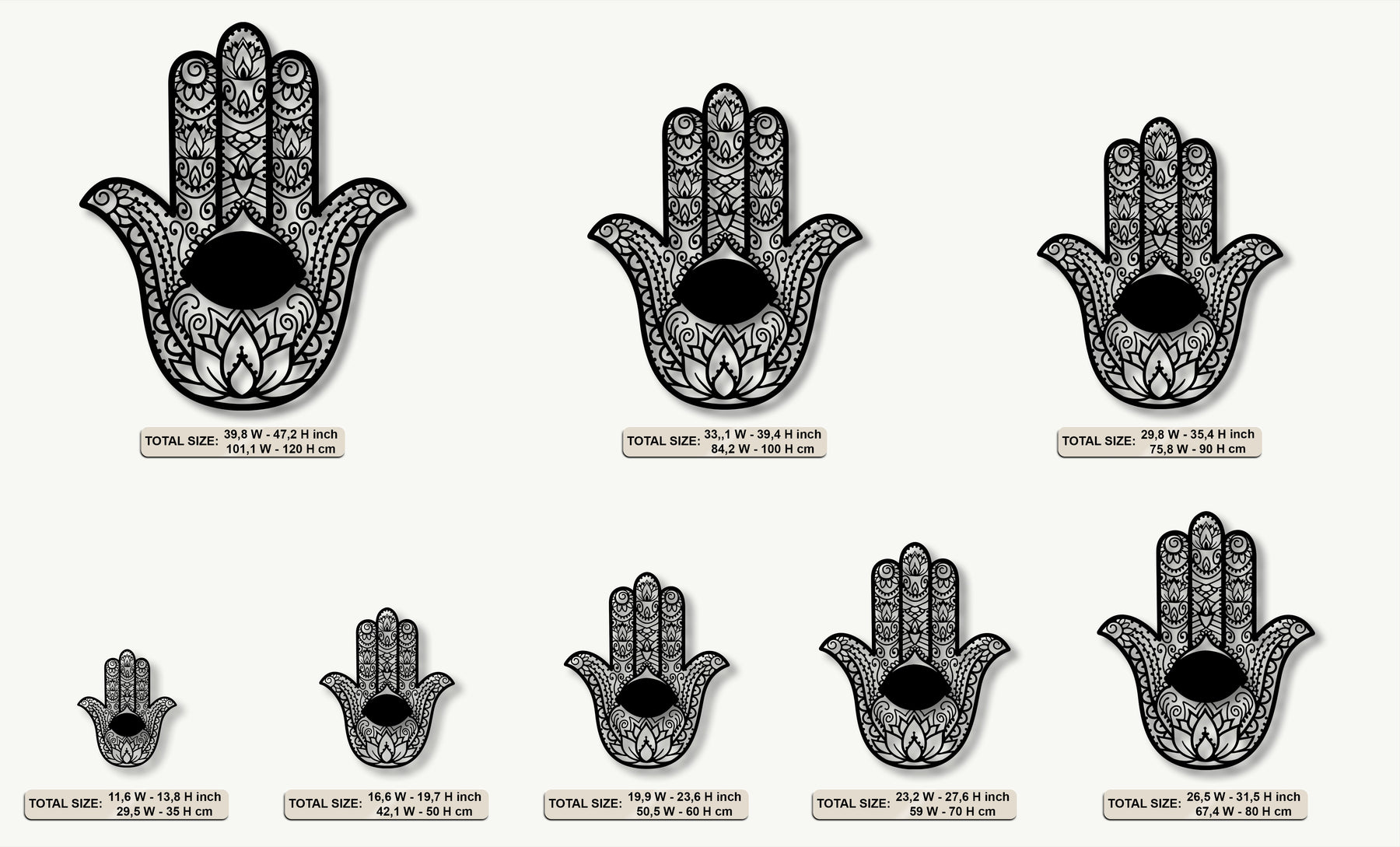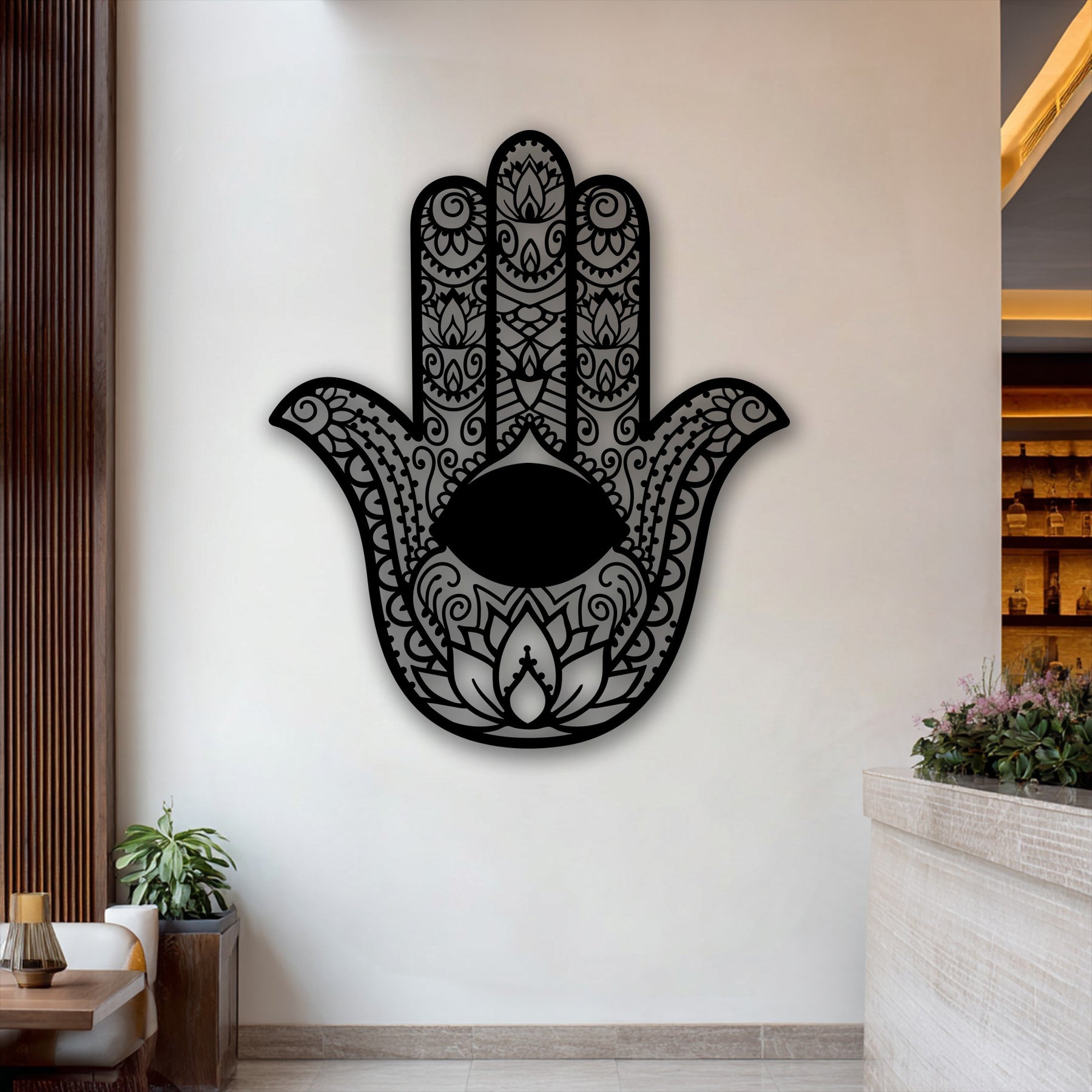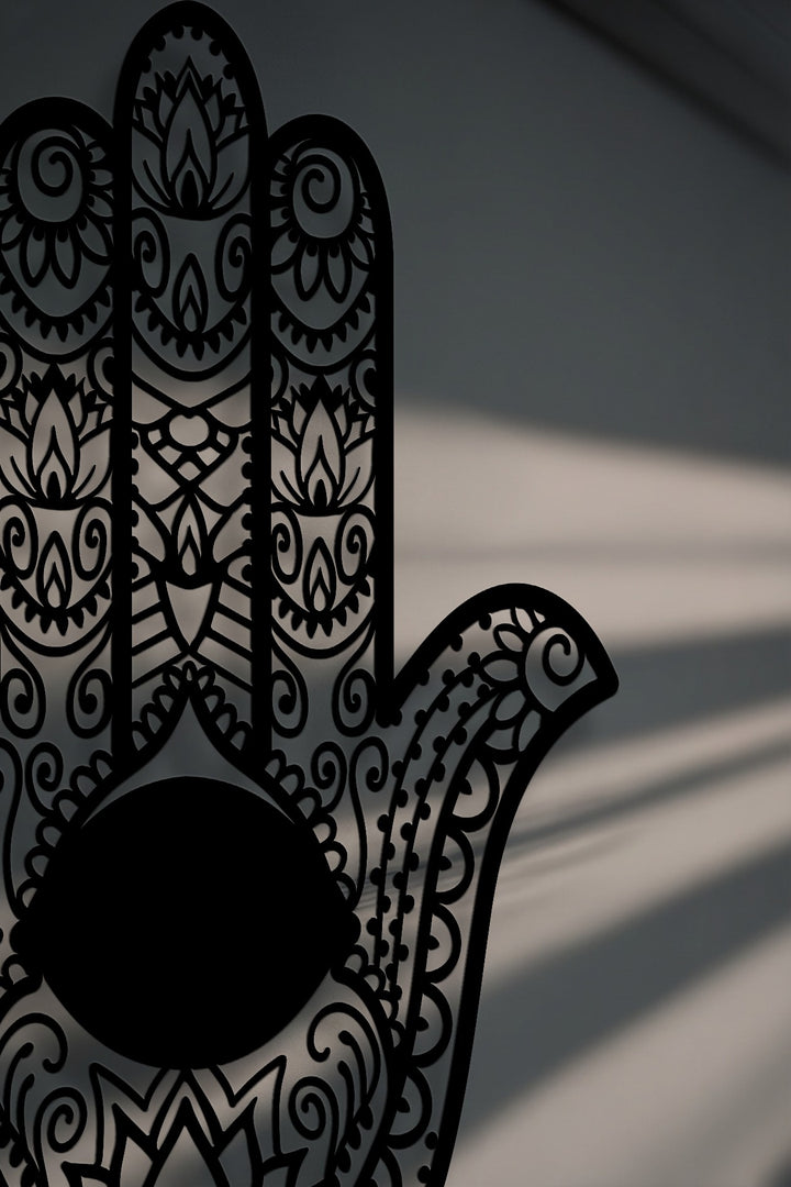 The ornamental Hamsa hand metal artwork creates impressive depth and layers, silhouetted with intricate cut-out details and an evil eye.