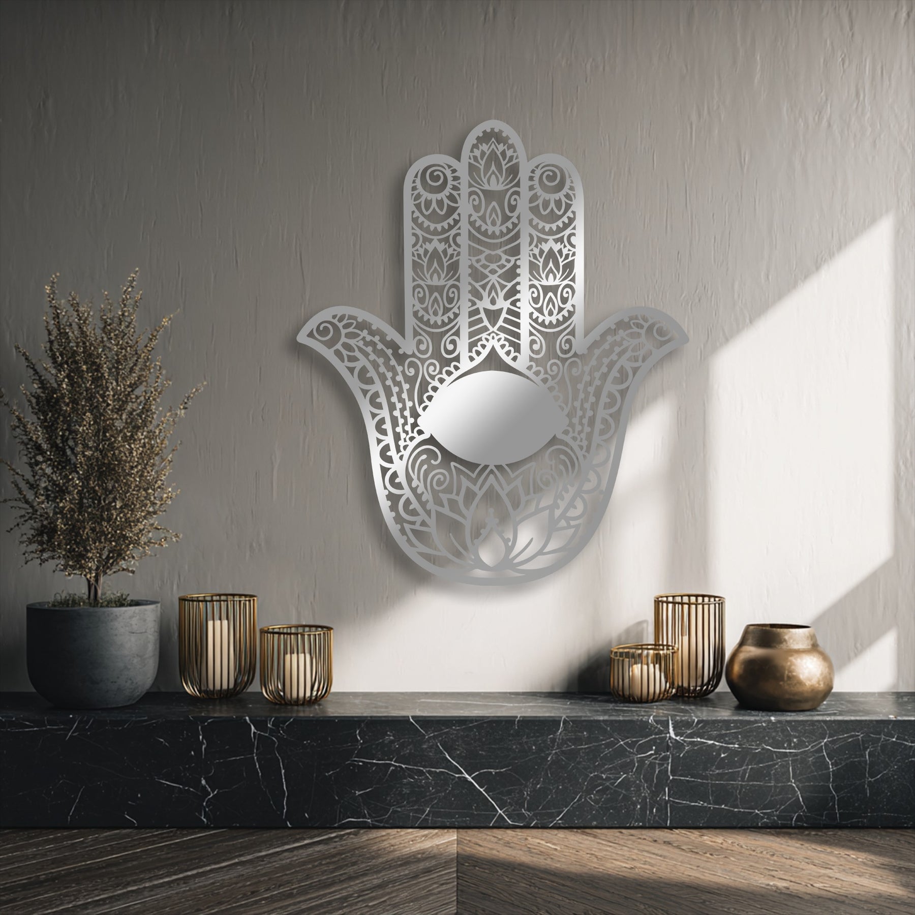 The warm color temperature highlights the intricate Hamsa Hand with Evil Eye metal wall decor, flanked by a potted plant and candles.