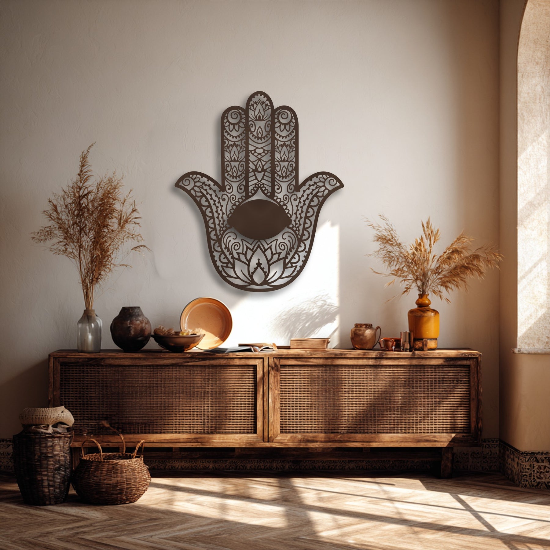 A prominent Hamsa Hand with Evil Eye metal artwork features intricate patterns, adding a spiritual and decorative touch to the room.