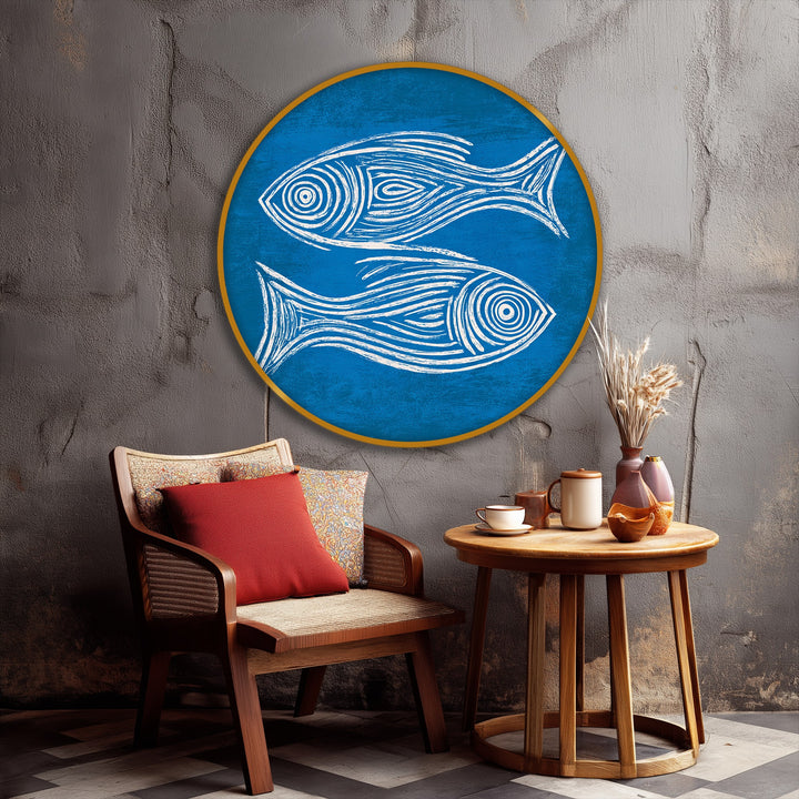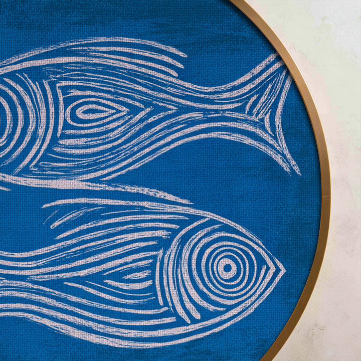 Bring a fresh coastal vibe into your space with this clean and modern round canvas print. Featuring two stylized fish illustrated in flowing white linework against a rich blue background, this artwork captures the simplicity and rhythm of ocean life. The hand-drawn aesthetic and textured backdrop create a relaxed, artistic feel that instantly brightens any wall.