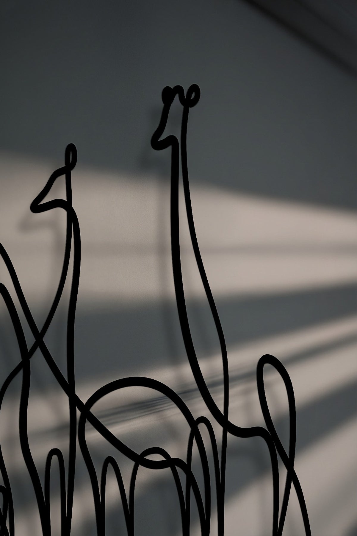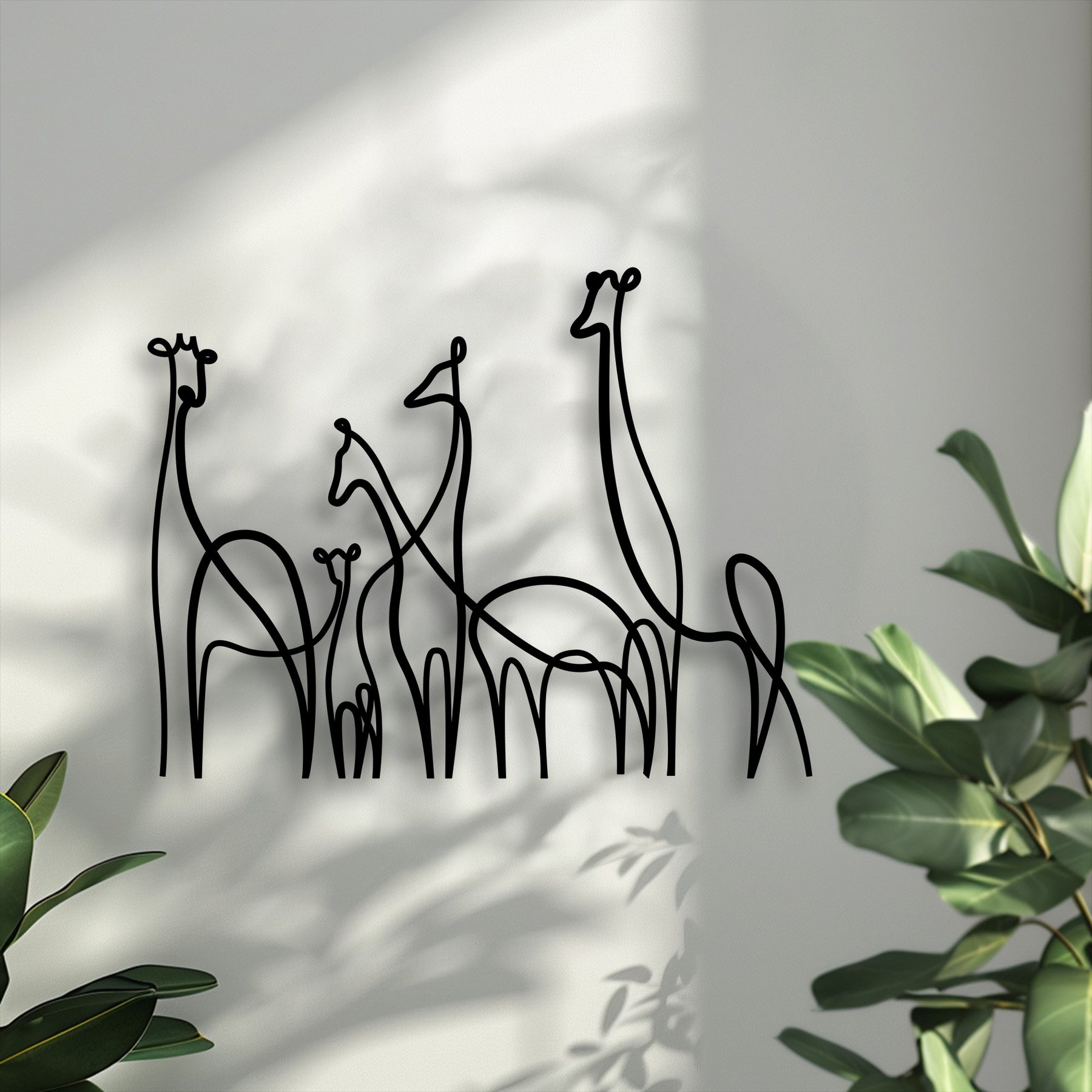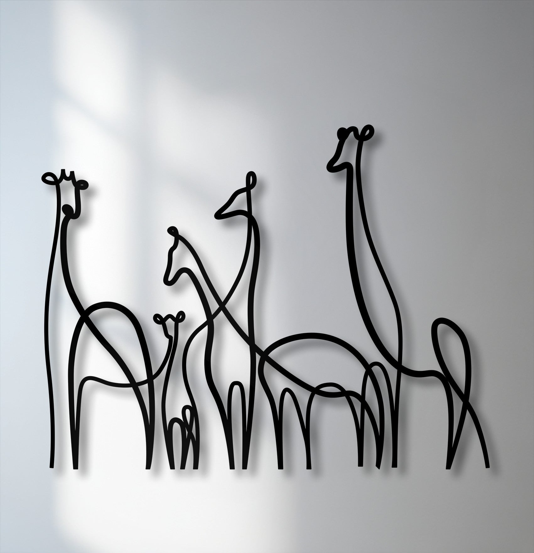 A graceful minimalist line art depiction of a giraffe family, crafted as black metal artwork, casting shadows on a wall.