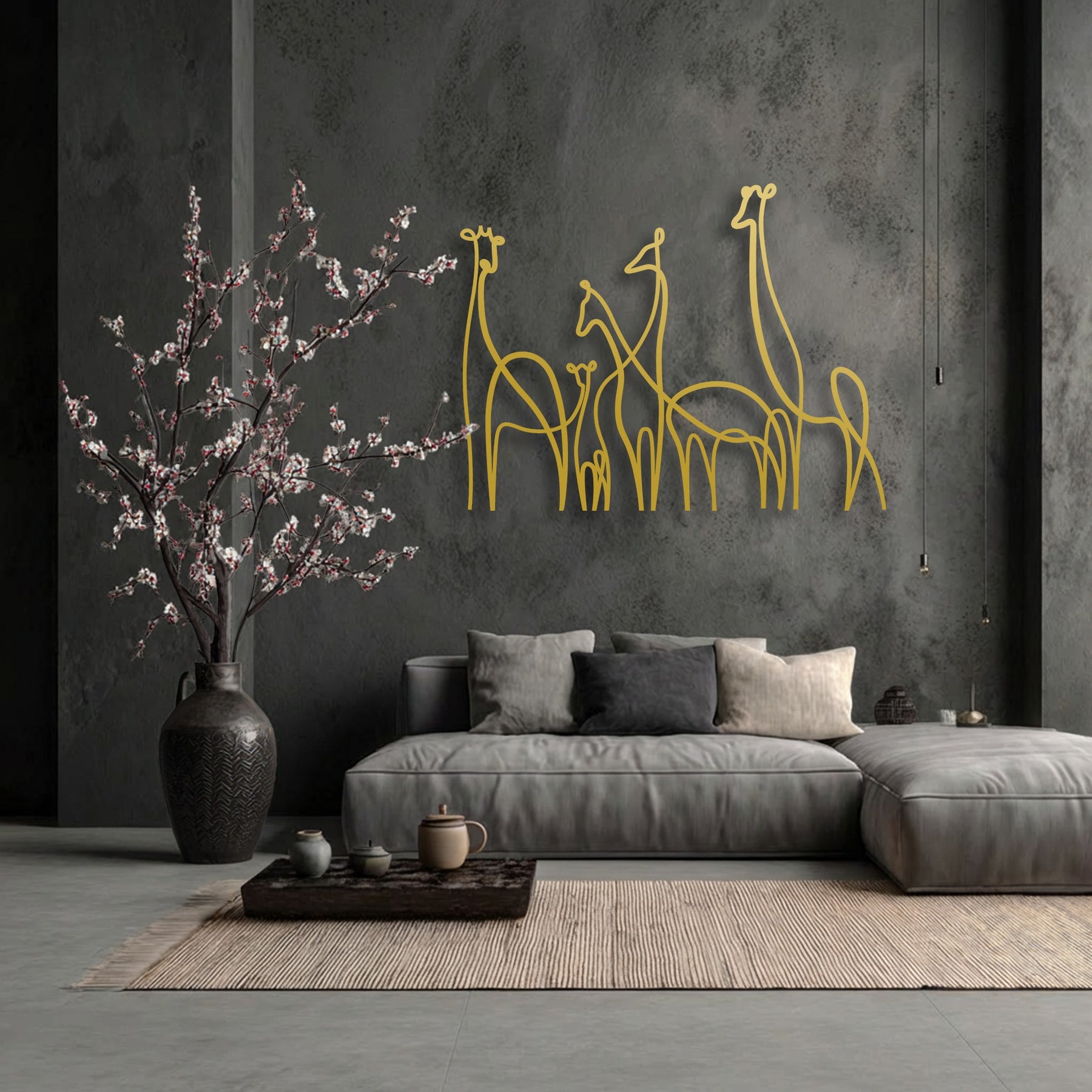 The background features a dark, textured grey wall, providing a modern backdrop for elegant metal wall decor depicting a minimalist giraffe family.