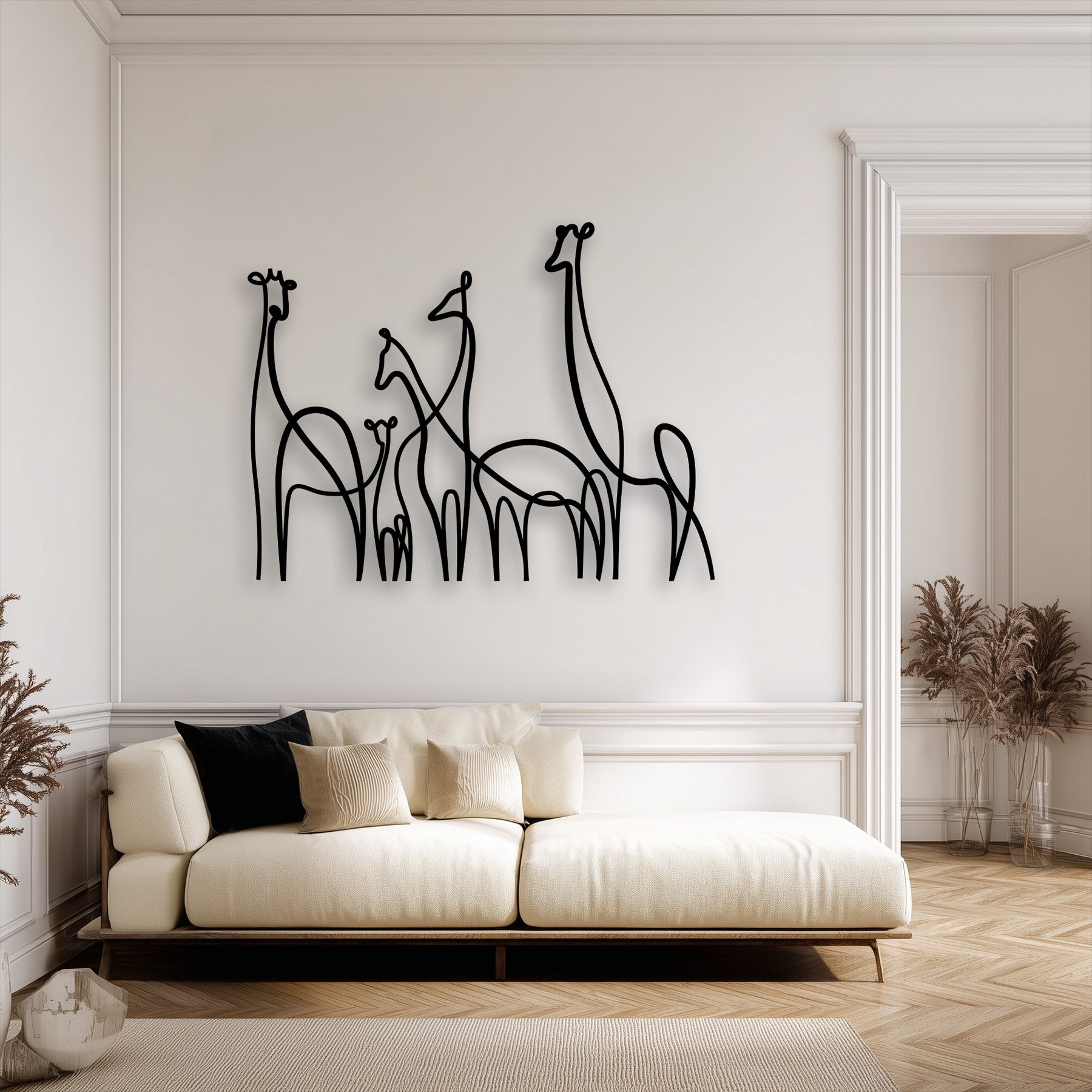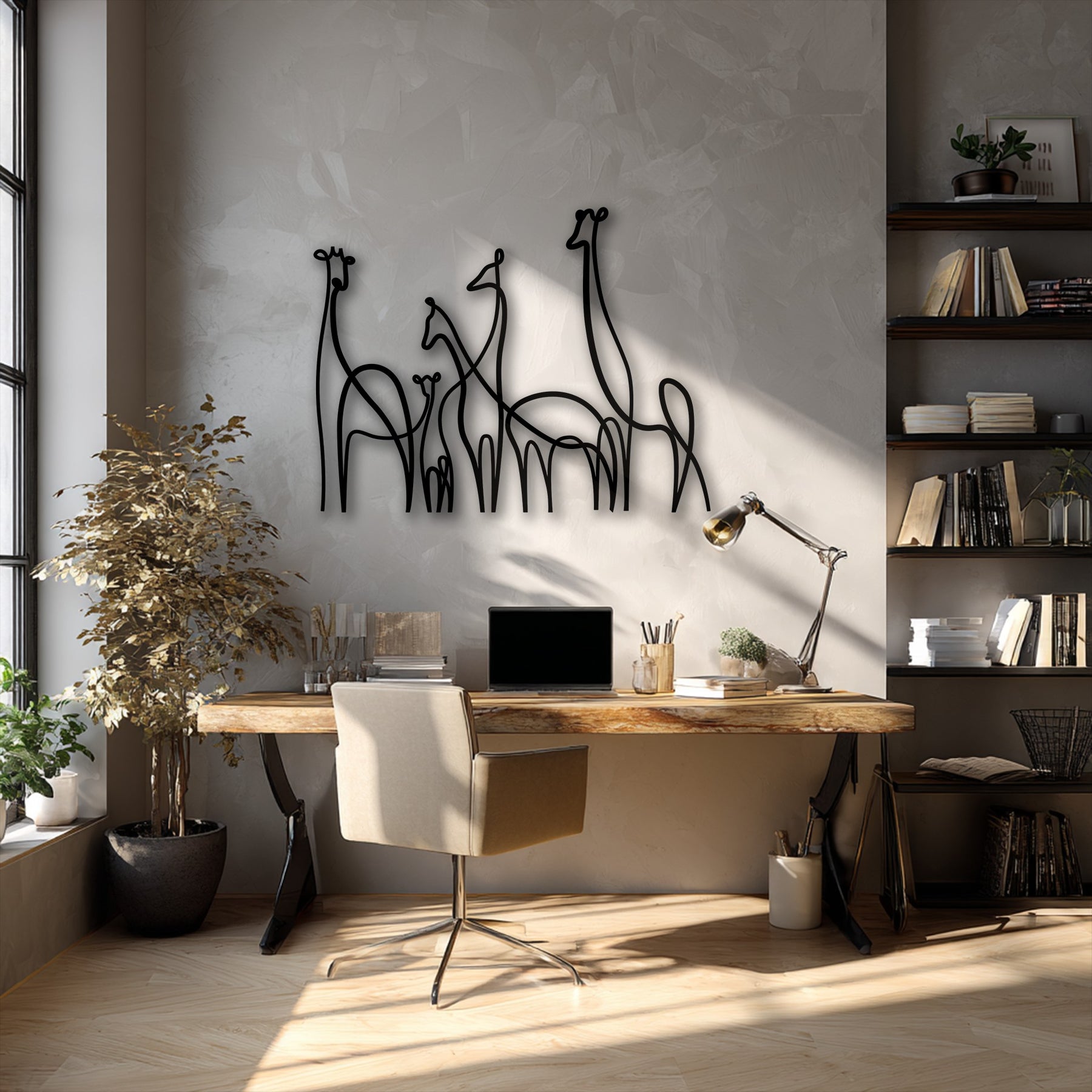 The focal point is an elegant white minimalist giraffe family line art, serving as captivating metal wall decor above a wooden console.