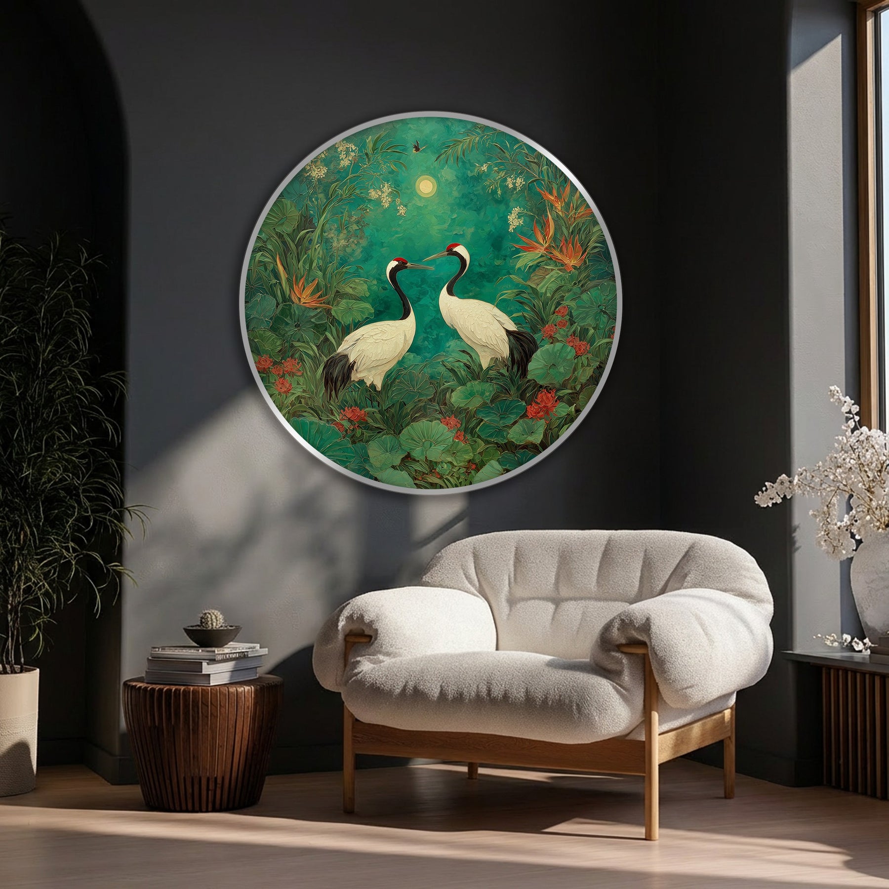 Step into a serene world where nature and harmony meet under the soft glow of moonlight. This round canvas print captures two elegant cranes standing gracefully amidst lush tropical foliage, surrounded by vibrant leaves and delicate blossoms. The rich emerald background and warm floral accents create a tranquil yet captivating atmosphere, while the gentle moon above adds a dreamy, poetic touch. Perfect for creating a peaceful focal point, this artwork brings balance, beauty, and a sense of calm into your living space.