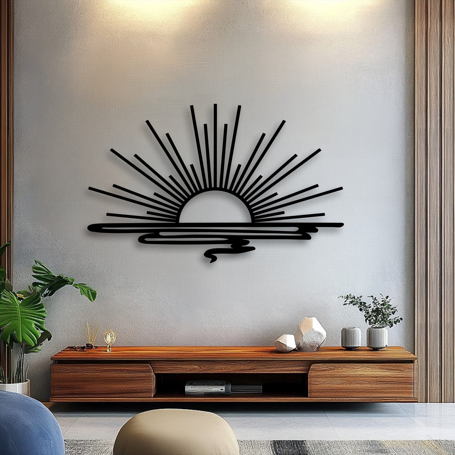 Bright white wall displaying sleek black minimalist sunrise metal wall art with radiant beams over calm water, perfect for modern decoration wall art.