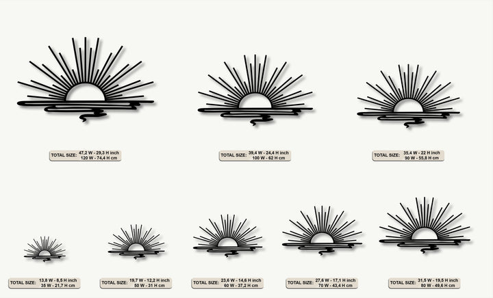 This horizontally oriented metal artwork displays a striking minimalist sunrise shape with radiant sun rays above serene wavy lines of water.
