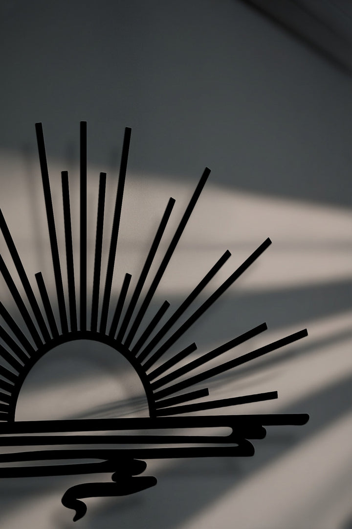 Radiant sunlight casts intriguing patterns of light and shadow, highlighting the minimalist sunrise decorative metal art on a pristine wall.