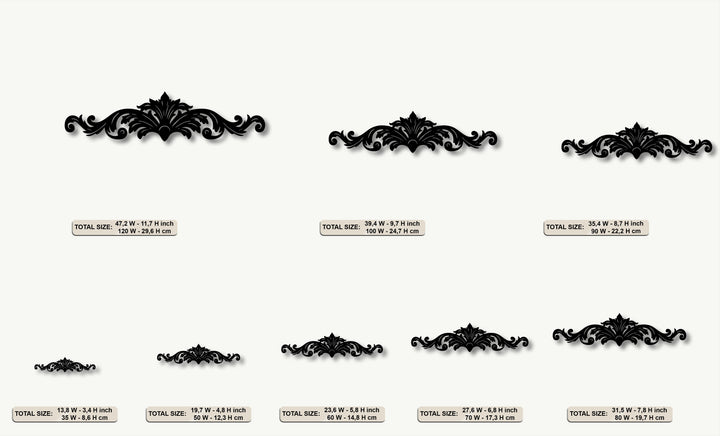 The organic forms of an intricate regal flourish ornamental scroll metal wall decor are showcased in multiple elegant color options.