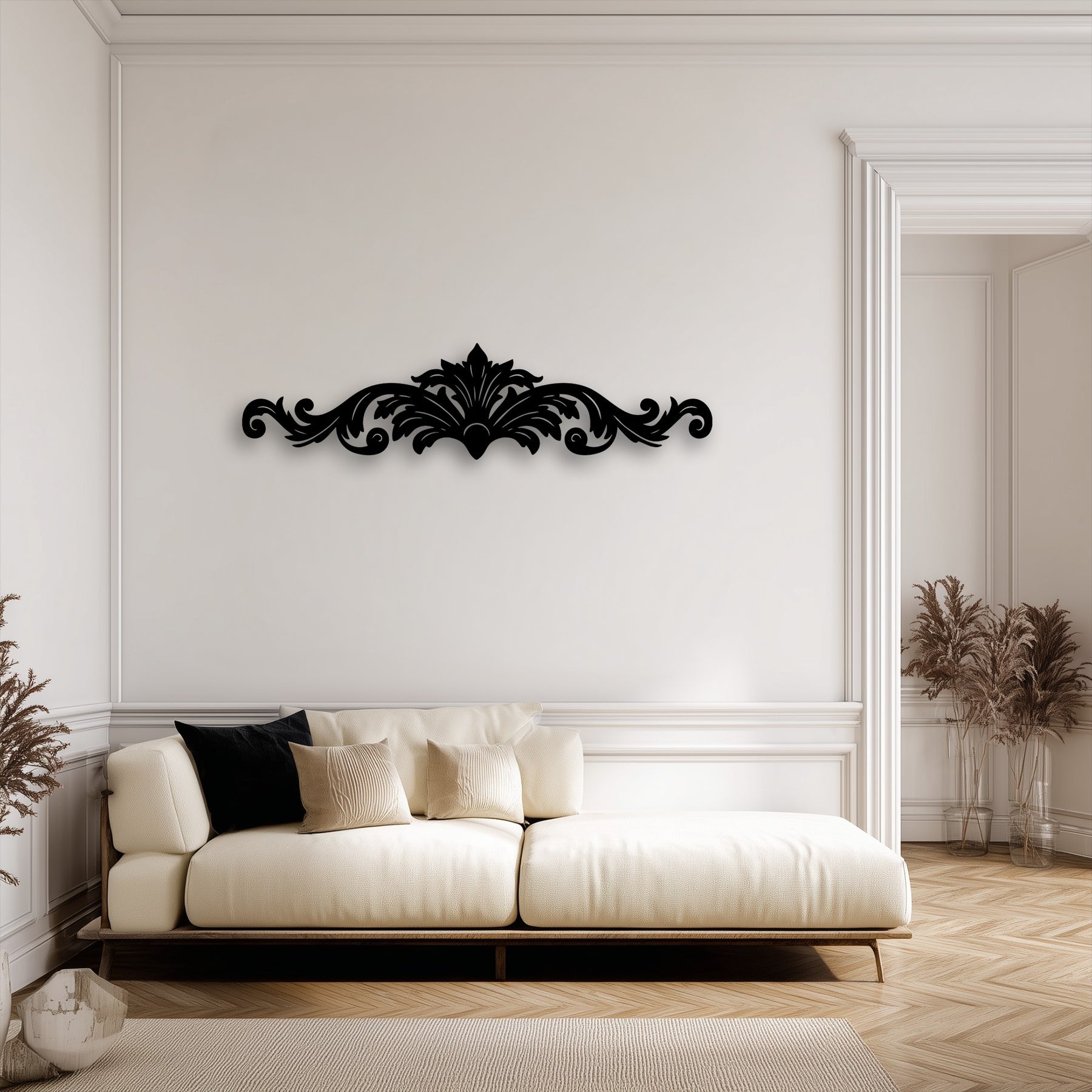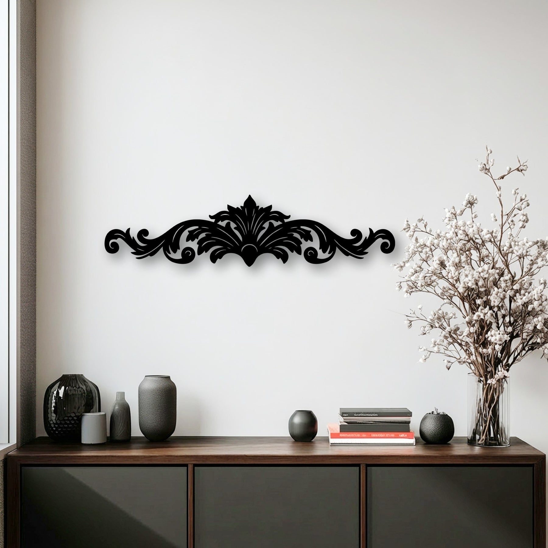 A bright white wall displays striking black ornamental scroll metal art for wall, complementing the dark decor on the wooden cabinet.