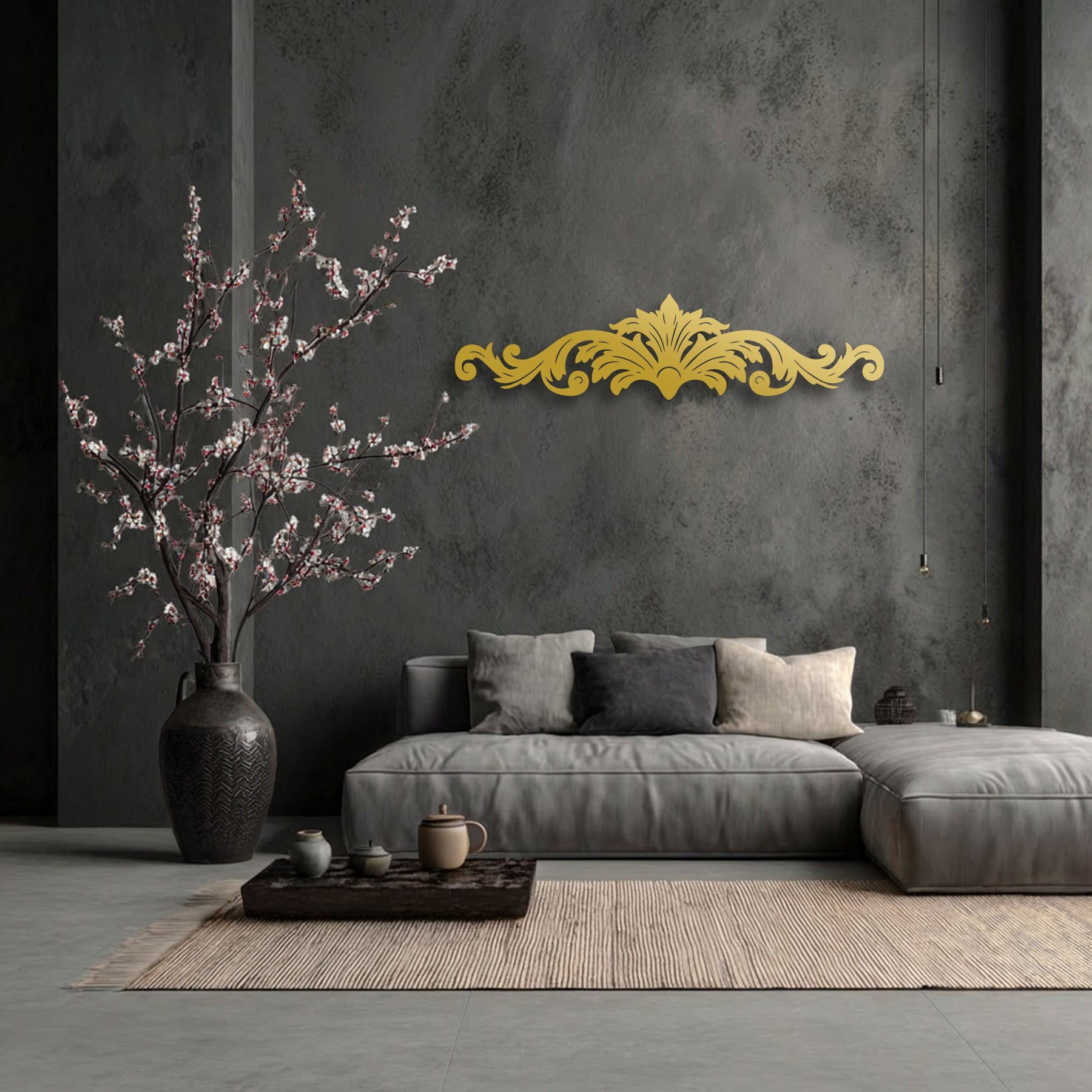 The brightest area reveals the intricate Regal Flourish – Ornamental Scroll Metal Wall Art, a sophisticated metal artwork on a textured wall.