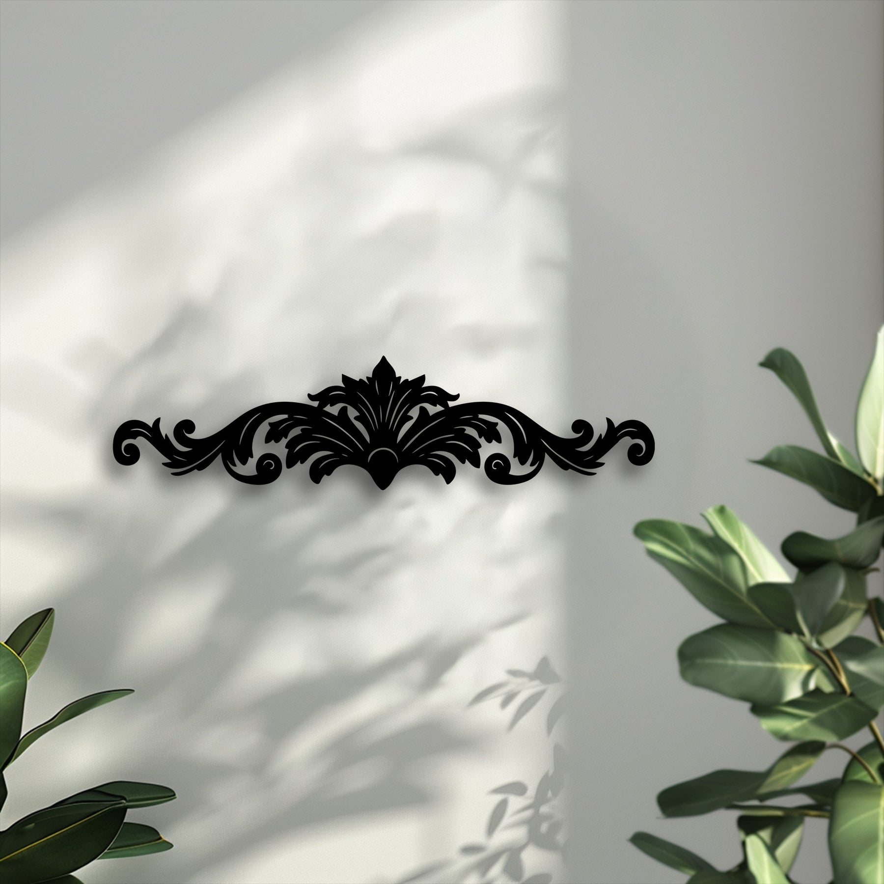 The darkest area showcases an ornate black Regal Flourish ornamental scroll decorative metal art piece centered on a textured light grey wall.