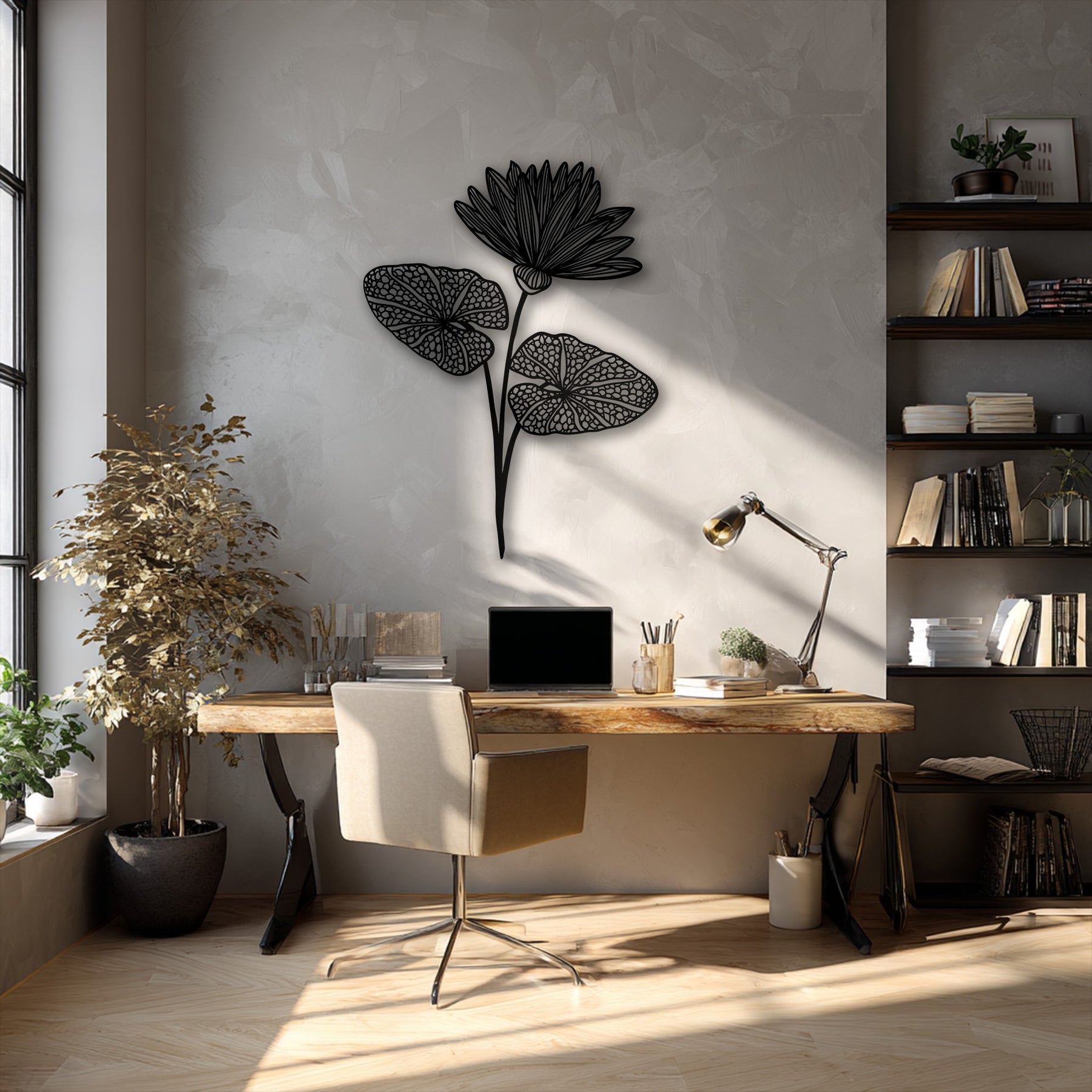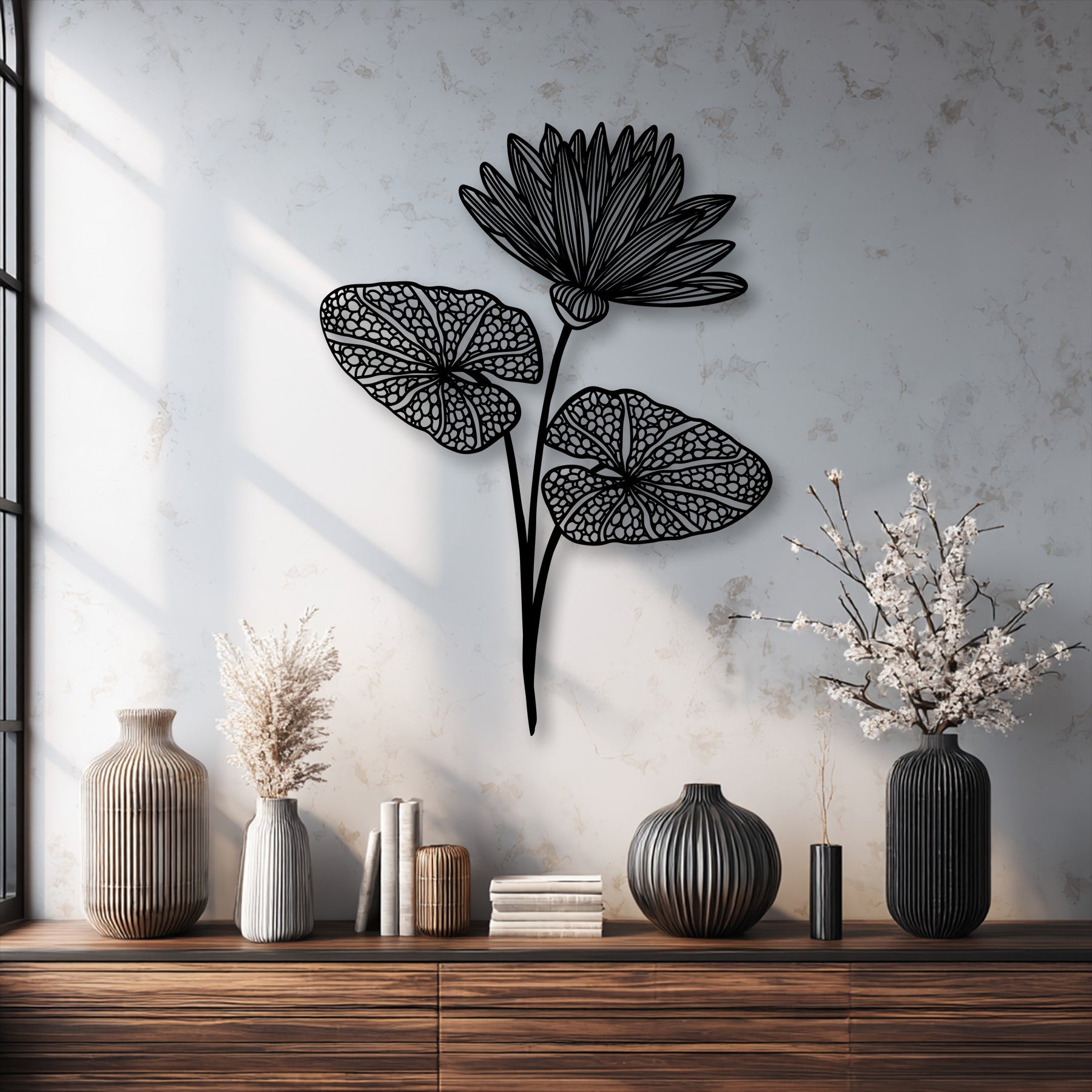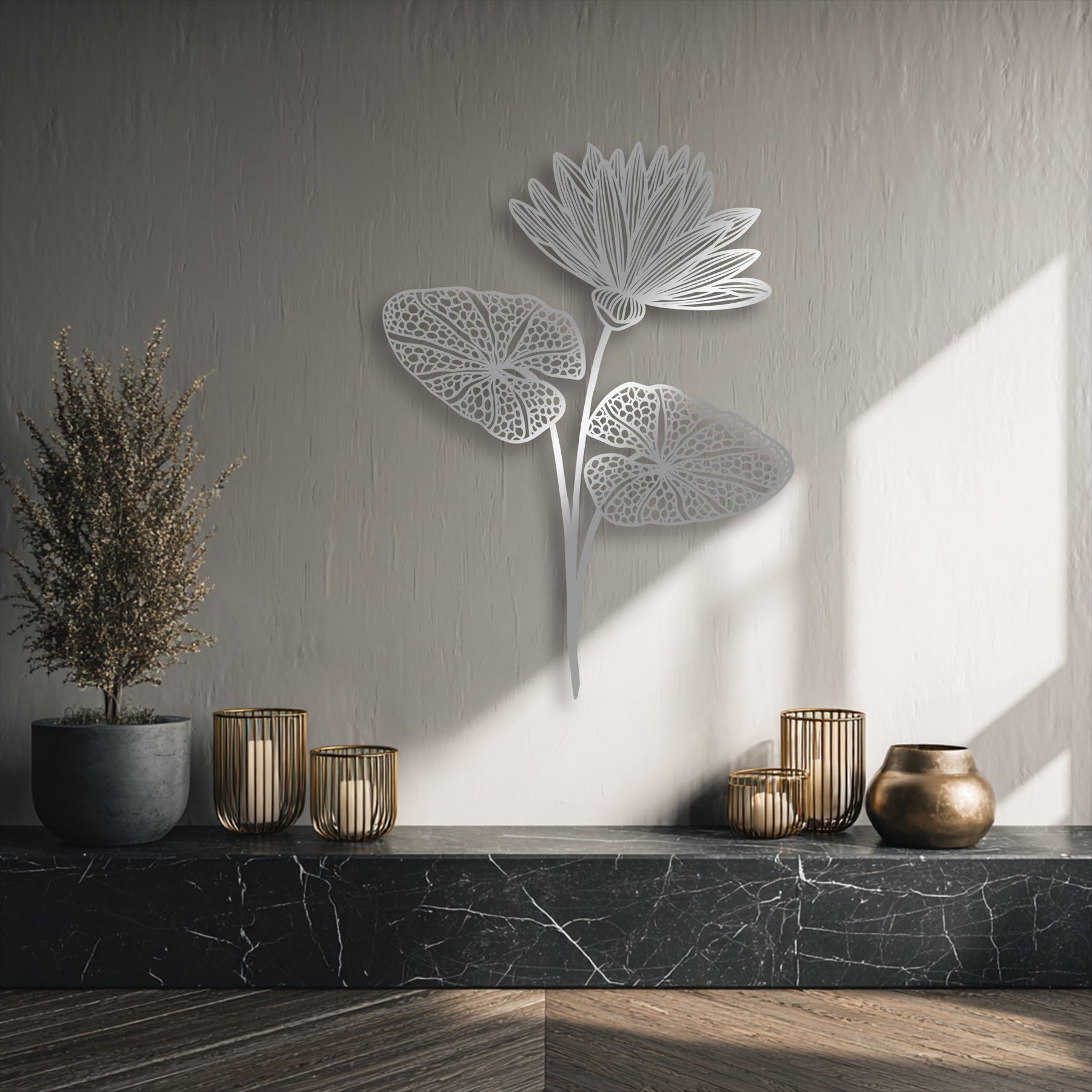 The layering effect of the elegant botanical metal artwork depicting a serene lotus bloom casts striking shadows, adding depth to the wall.