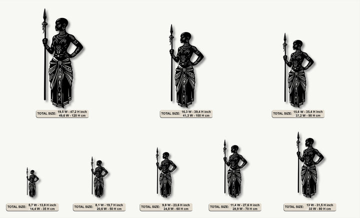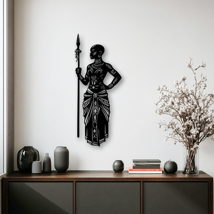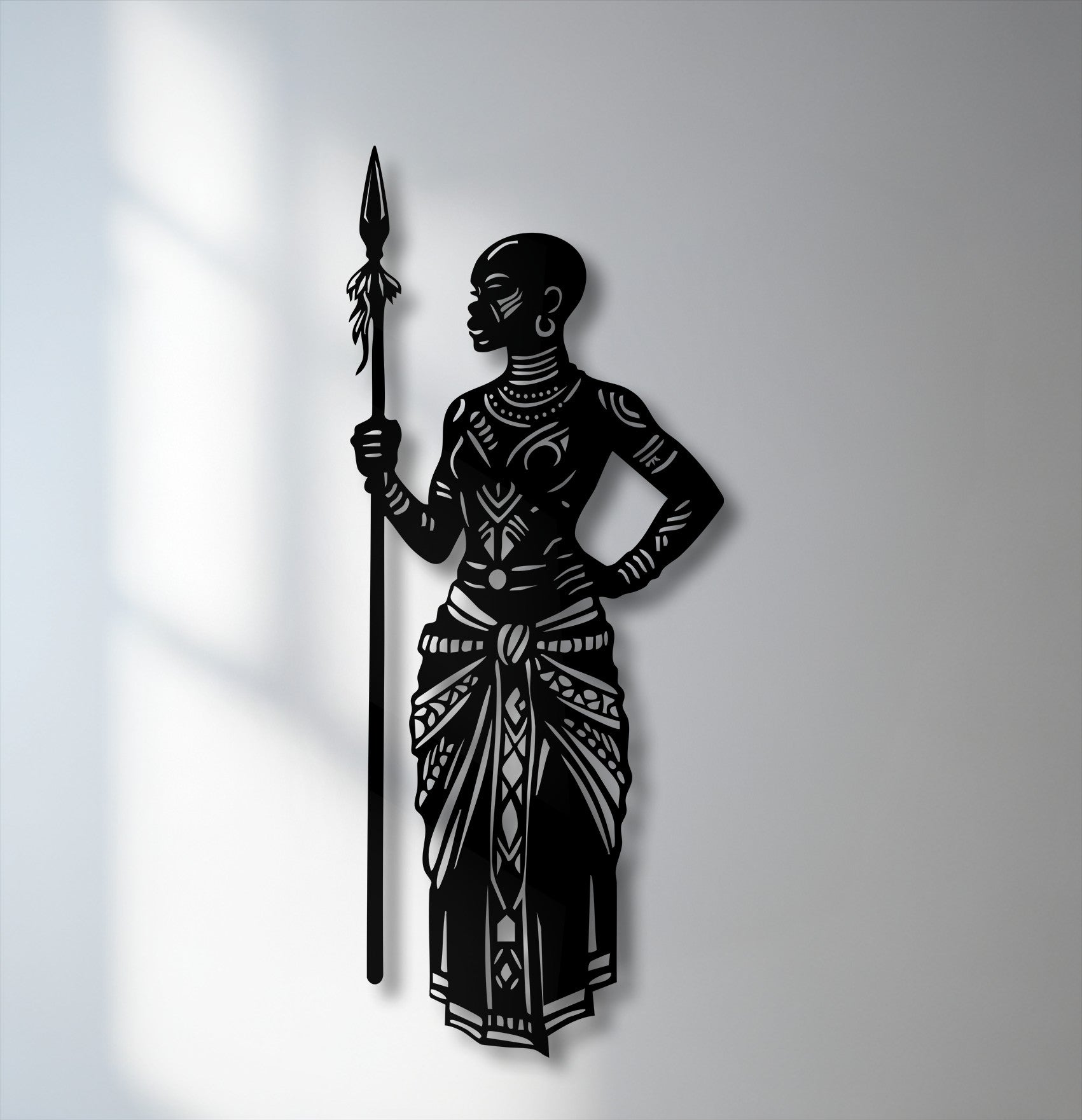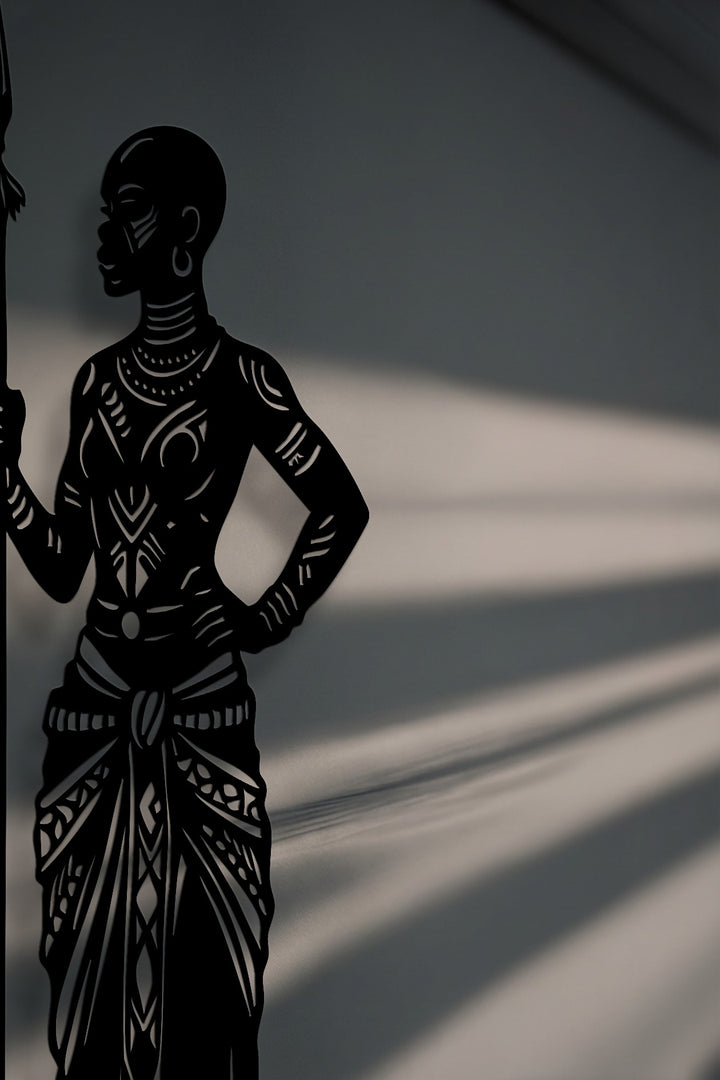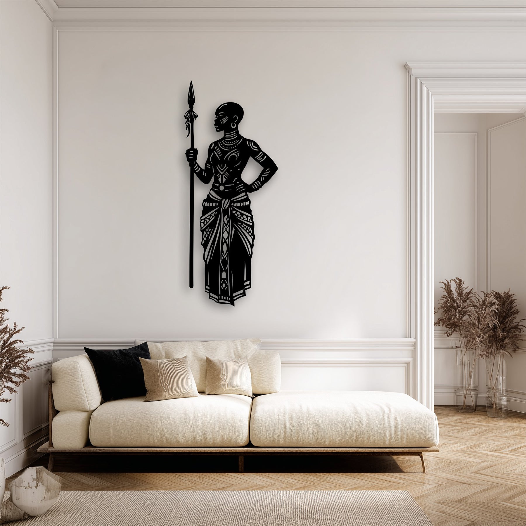 A striking transition from the bright wall to the powerful black silhouette of the Cultural African Warrior metal art for wall.