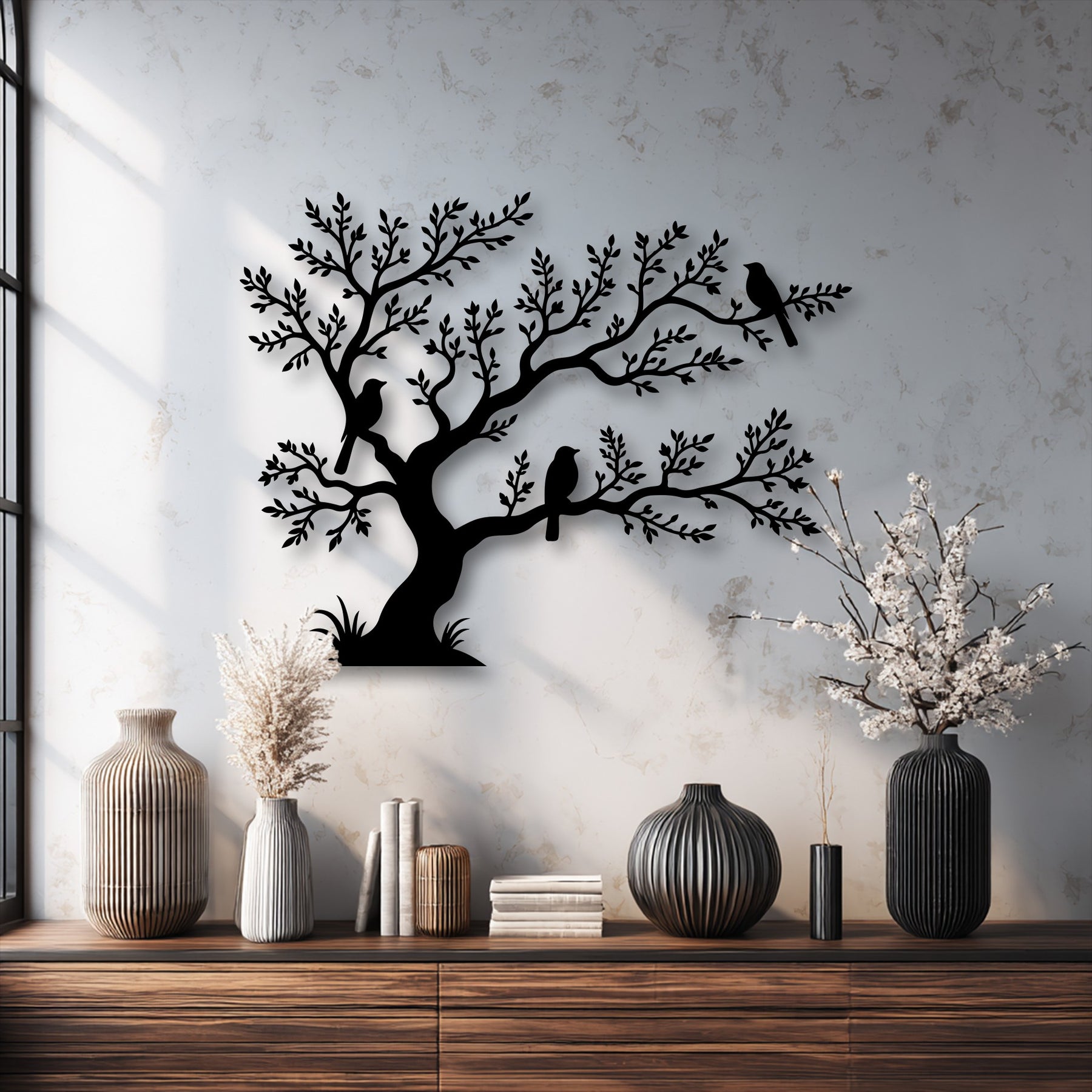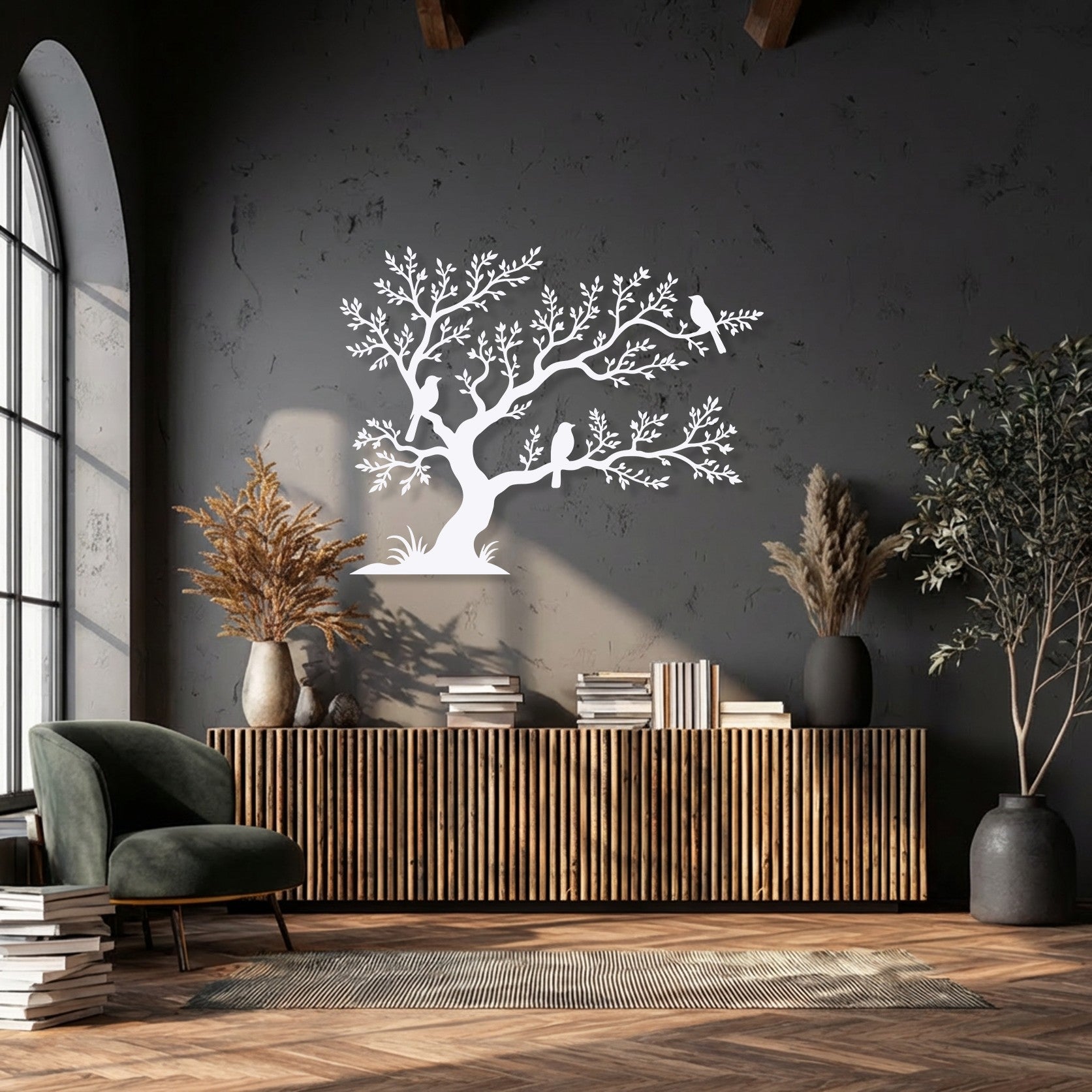 A neutral color temperature defines the 'Birds on Tree Metal Wall Art,' a striking decoration wall art above warm wooden furniture.