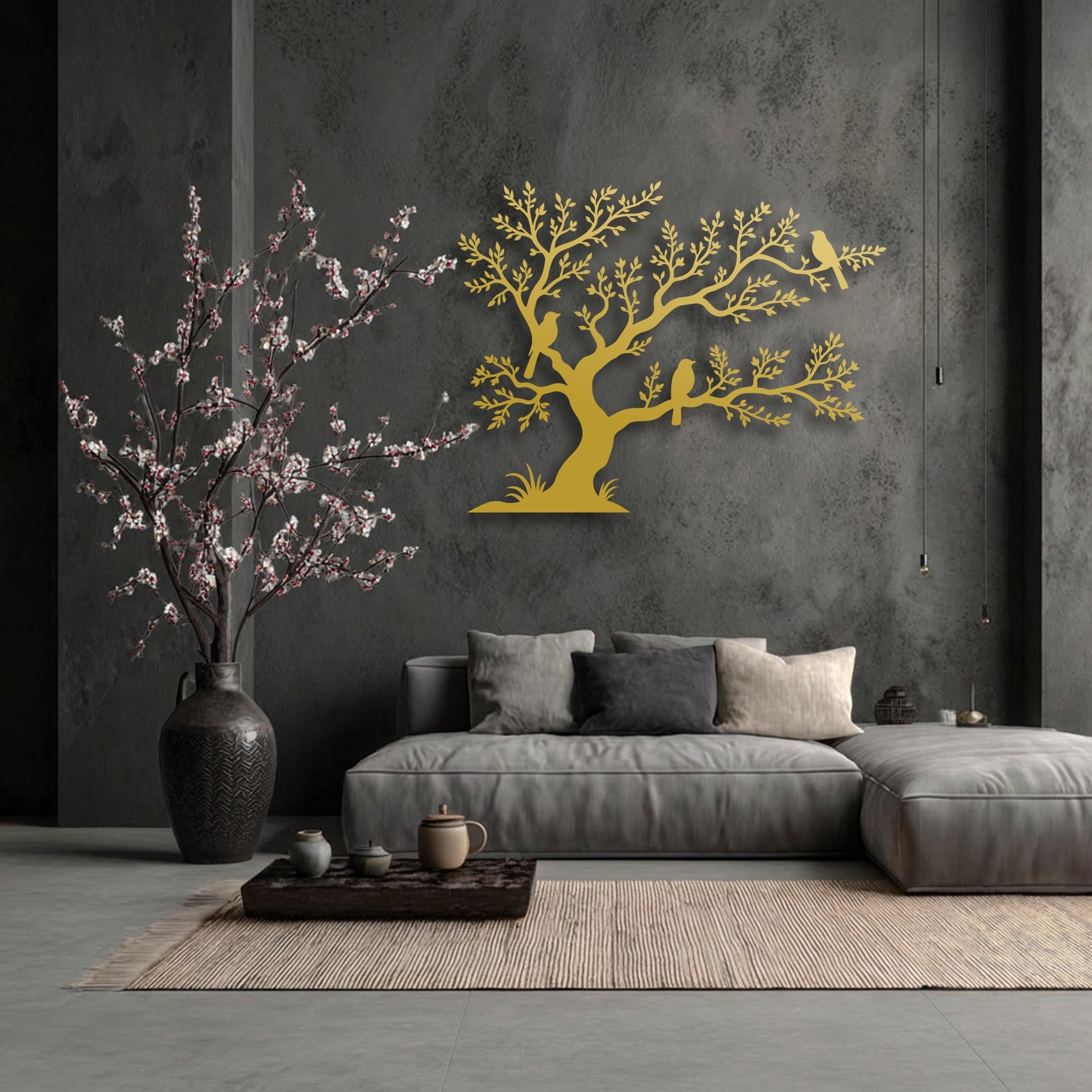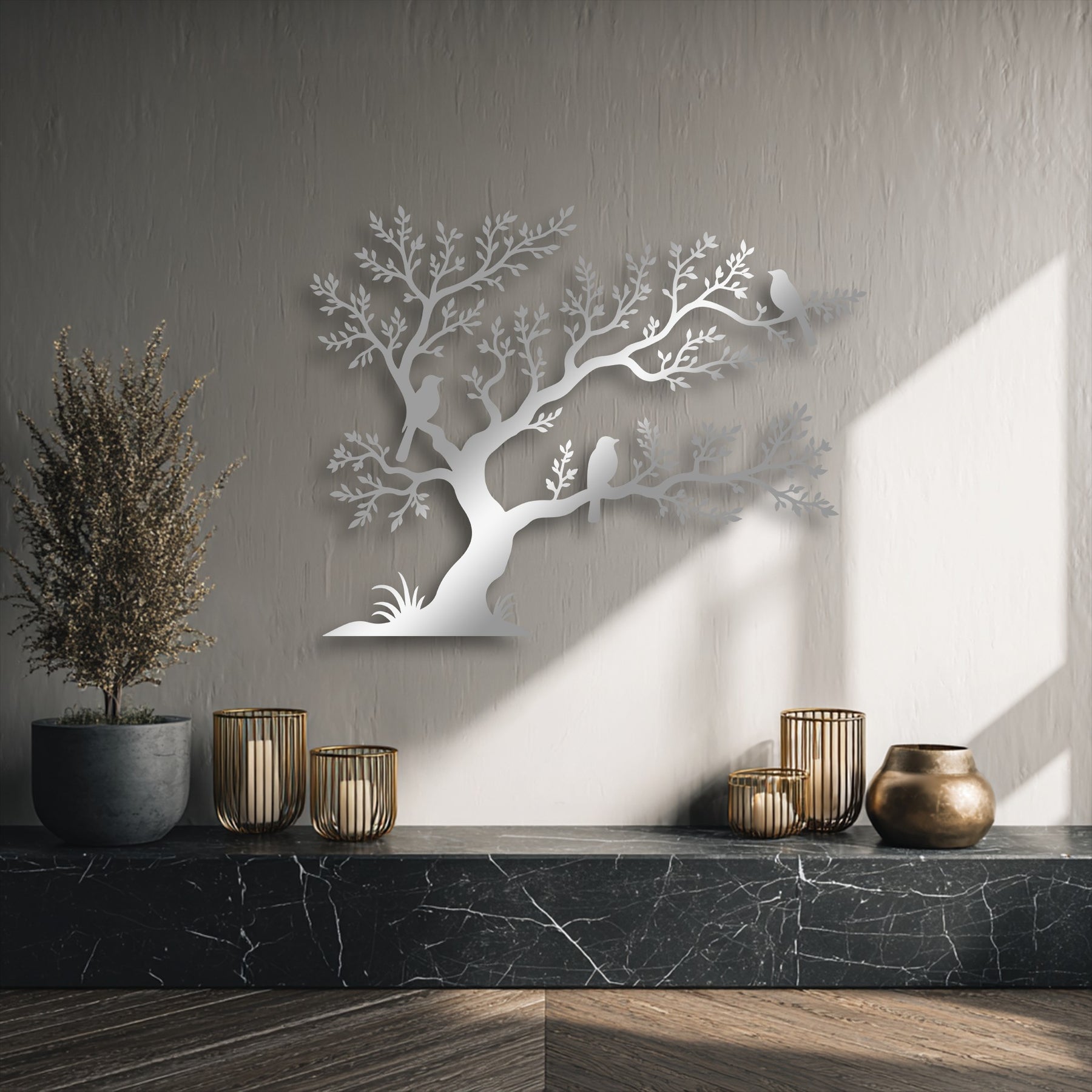 The layered metal art for wall featuring birds on a tree creates a distinct visual depth against the textured wall, complemented by foreground objects.