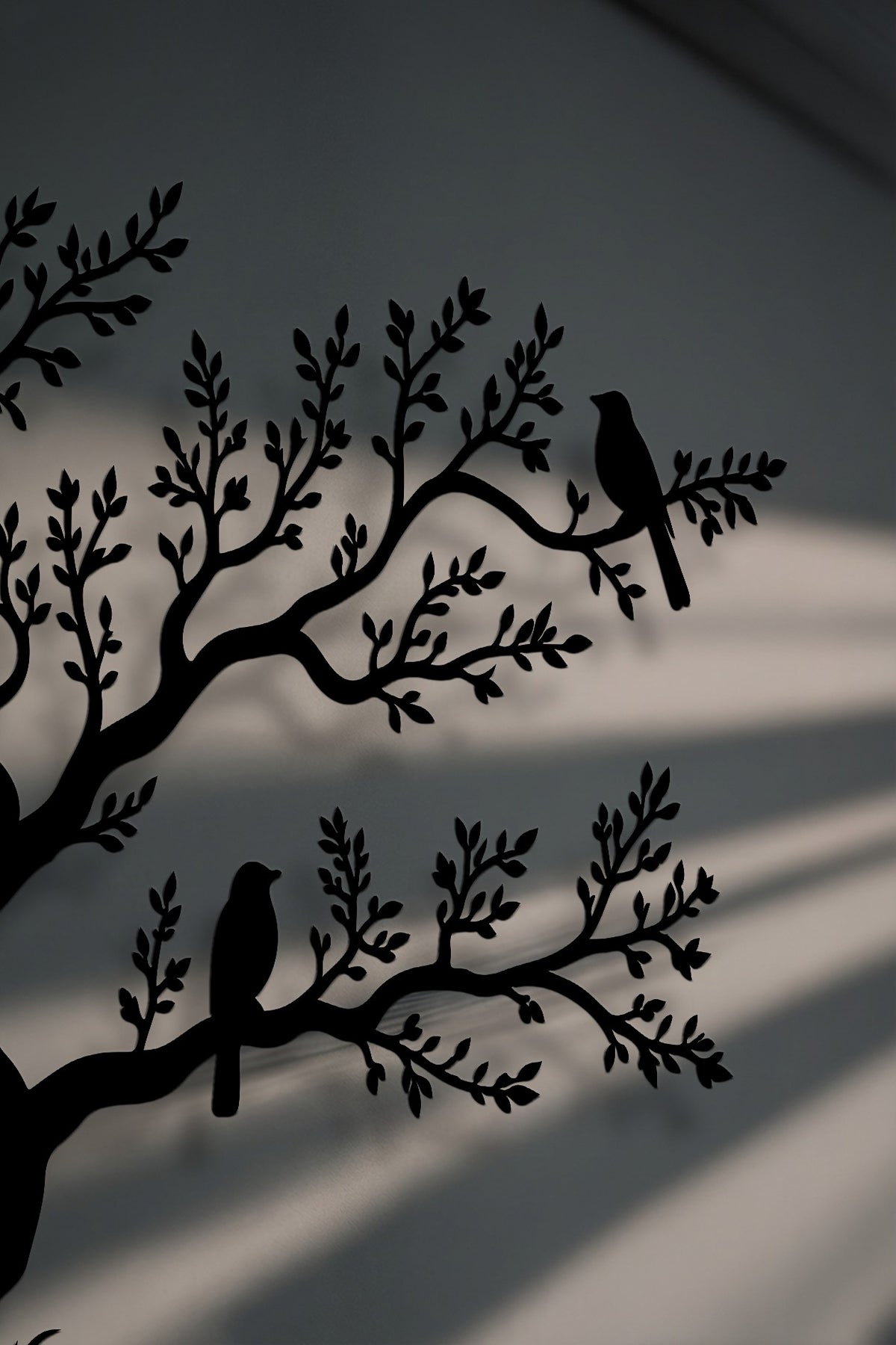 The abstract silhouette of birds perched on decorative metal art tree branches casts an elegant shadow on a textured wall.
