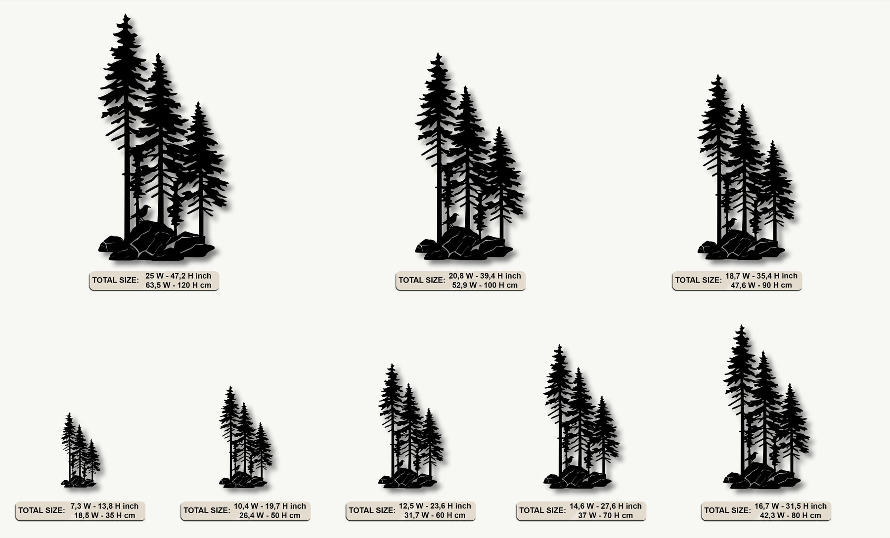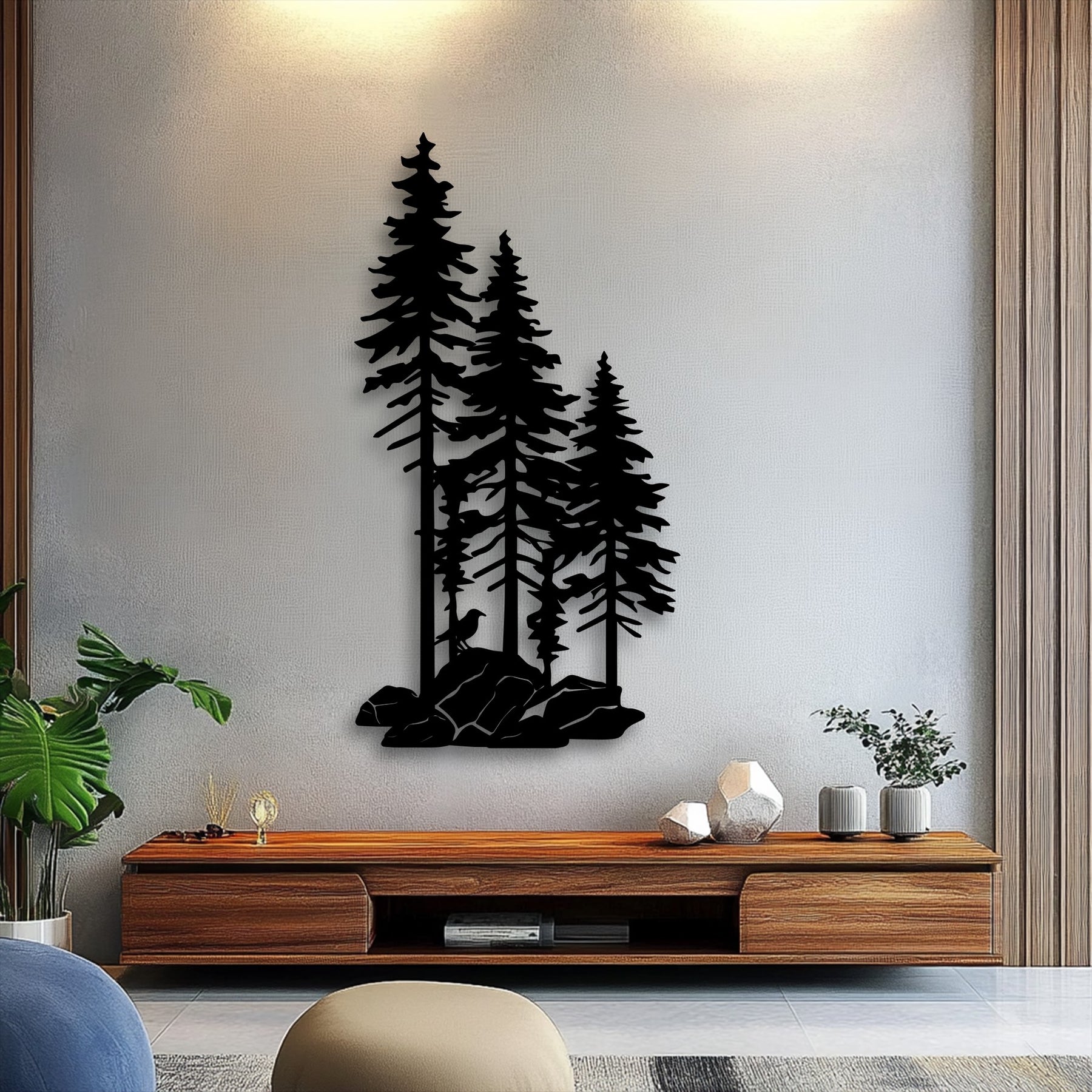 The stylized metal pine forest silhouette suggests a gentle wind, adding a flowing sense of movement as charming decoration wall art.