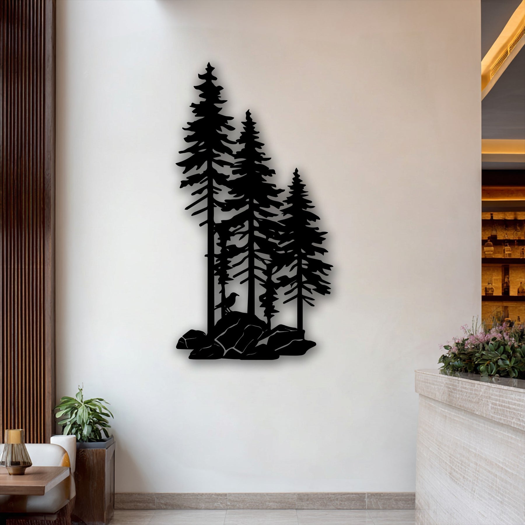 The stillness of a serene pine forest is beautifully rendered in this decorative metal art, featuring towering trees and a quiet bird.