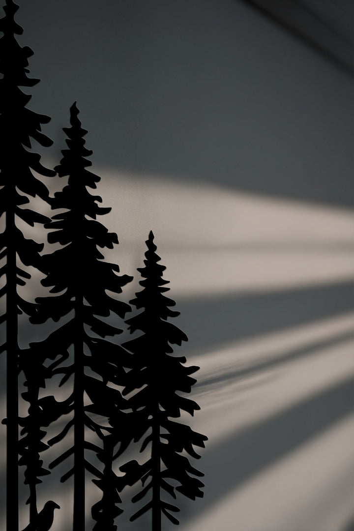 With a profound sense of depth and intricate layers, a decorative metal art piece featuring a pine forest silhouette casts captivating shadows.