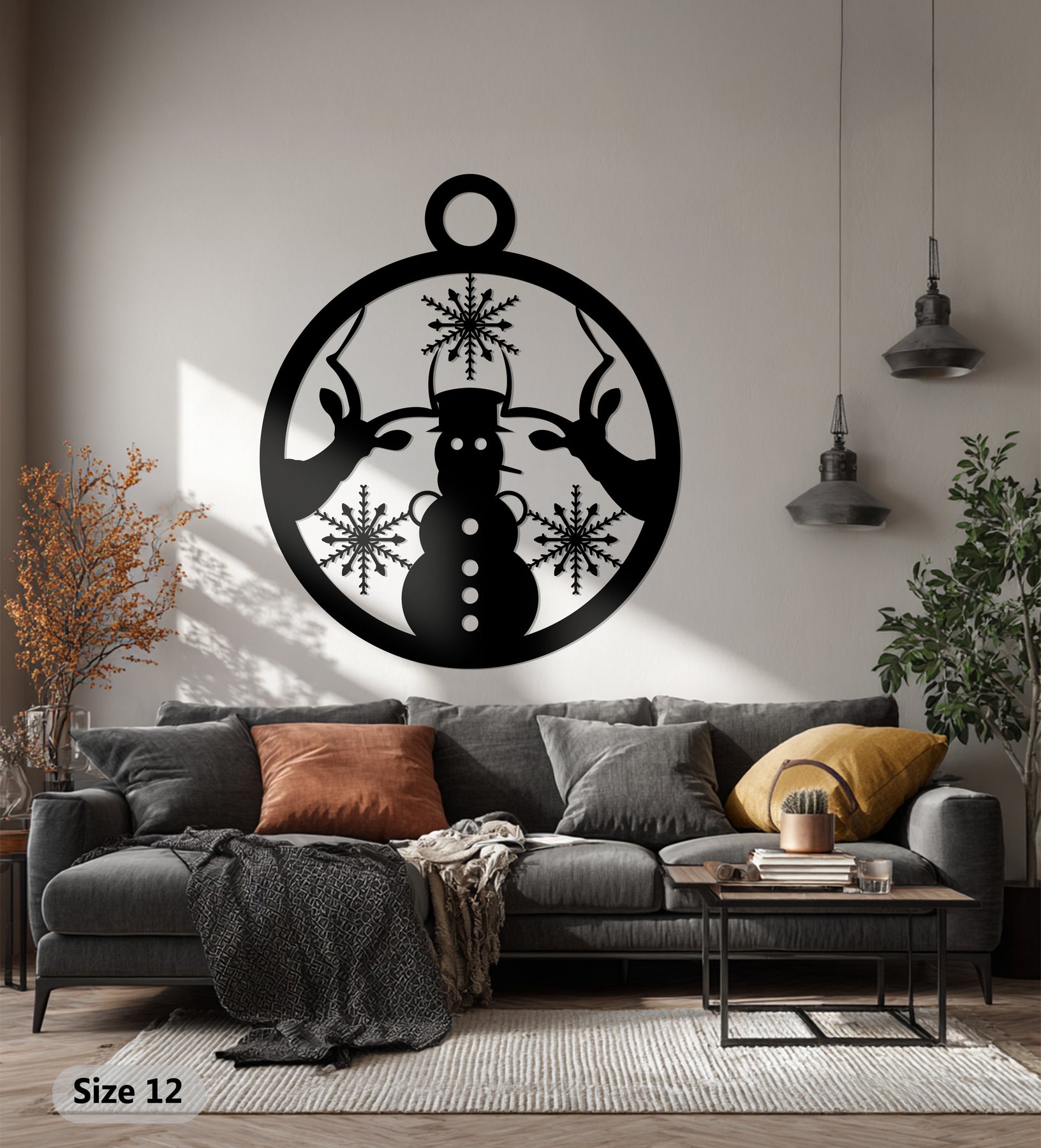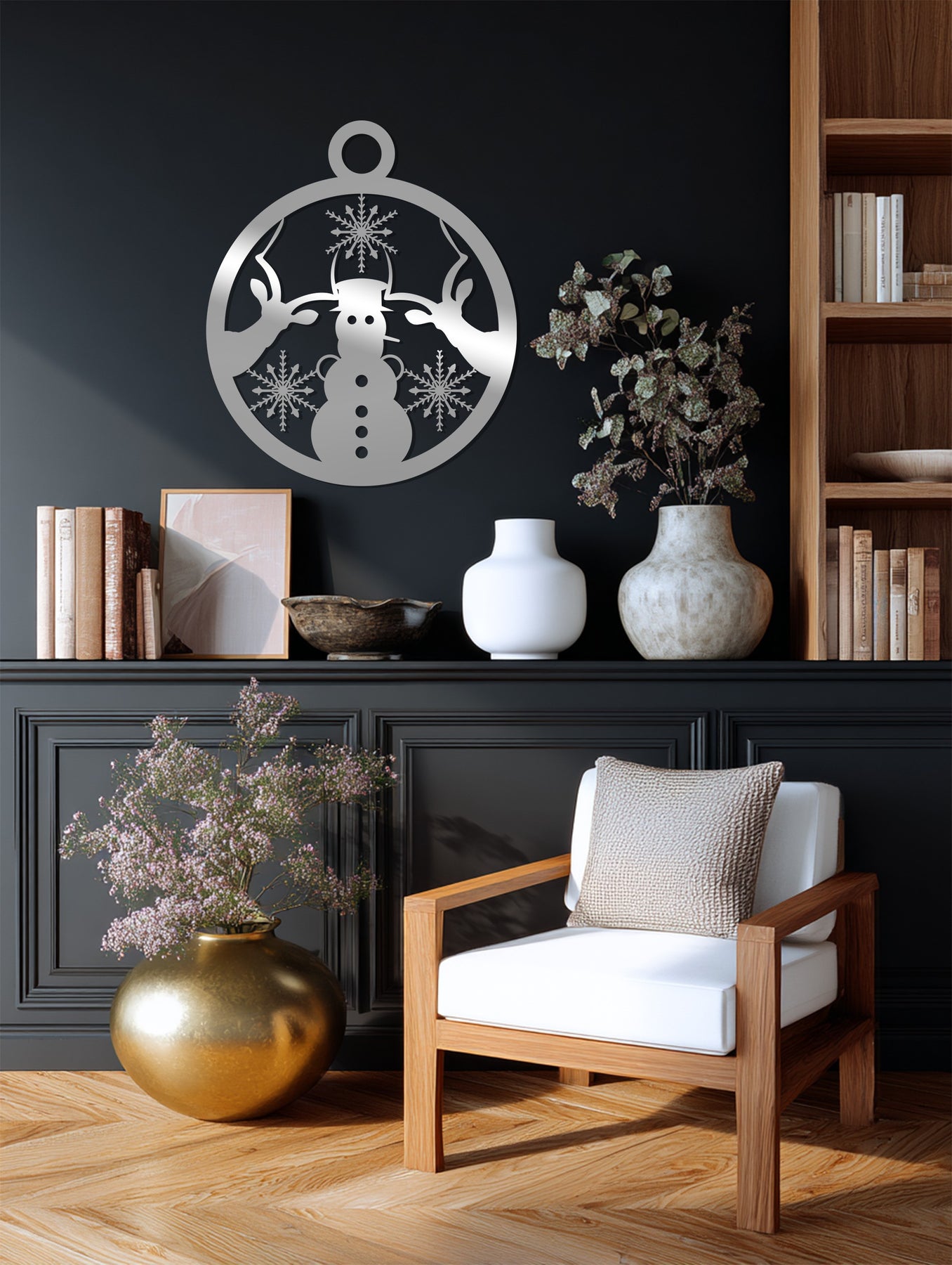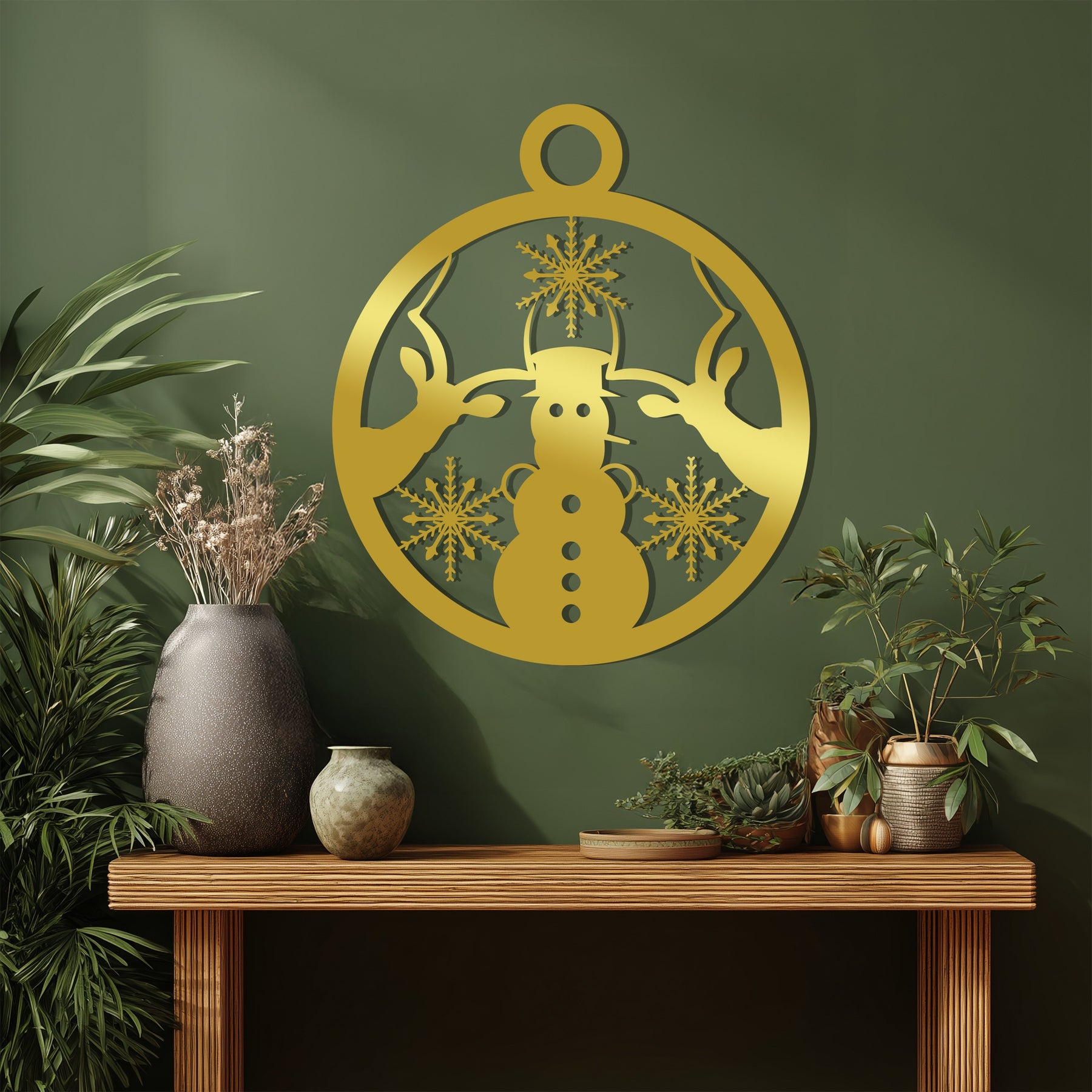 Celebra la bellezza dell'inverno con Abbraccio invernale Decorazioni Murali in MetalloQuesto pezzo festivo raffigura un gioioso pupazzo di neve circondato da eleganti renne e delicati fiocchi di neve, simboleggiando calore, armonia e la magia delle festività natalizie. La sua forma circolare lo rende il centrotavola perfetto per qualsiasi tema natalizio.