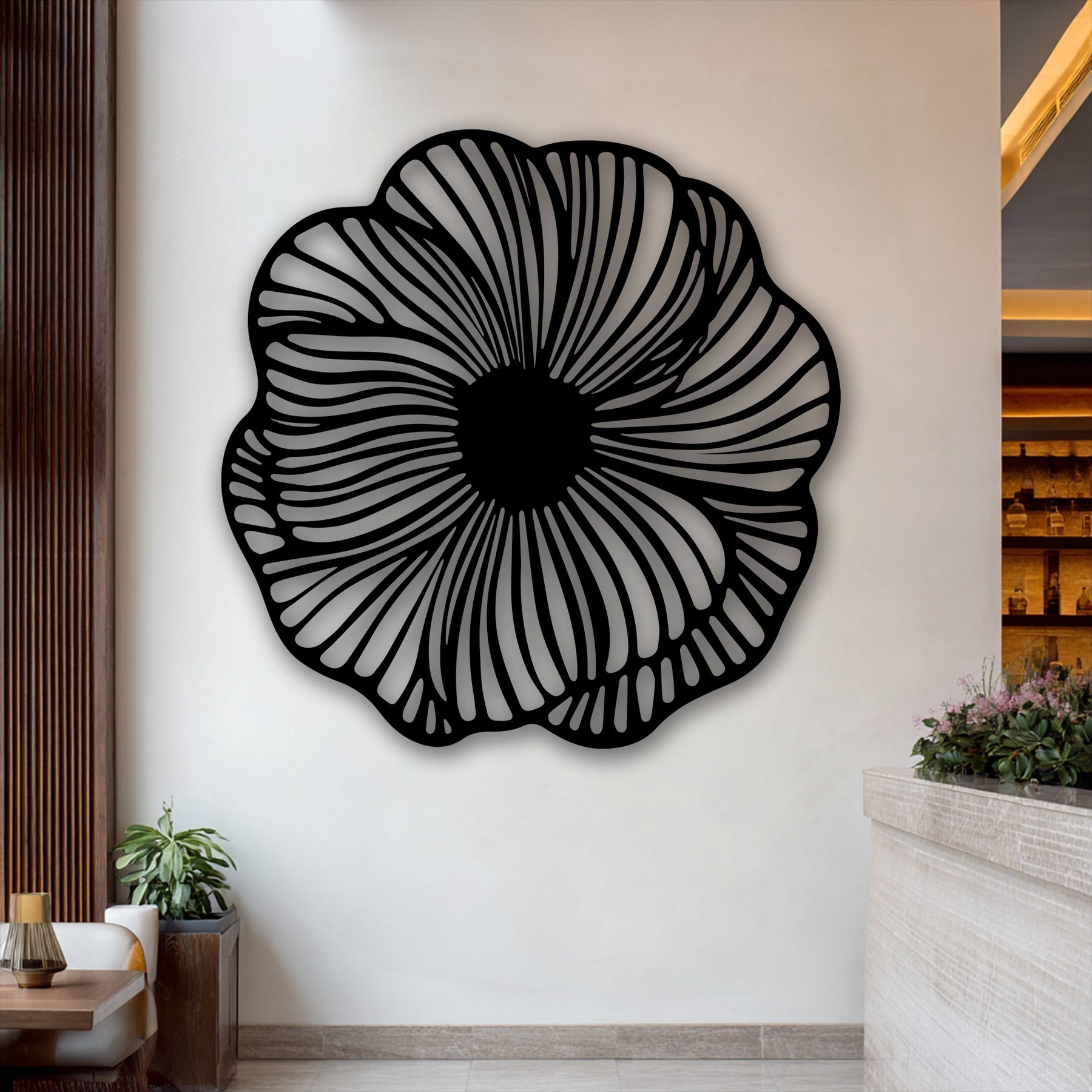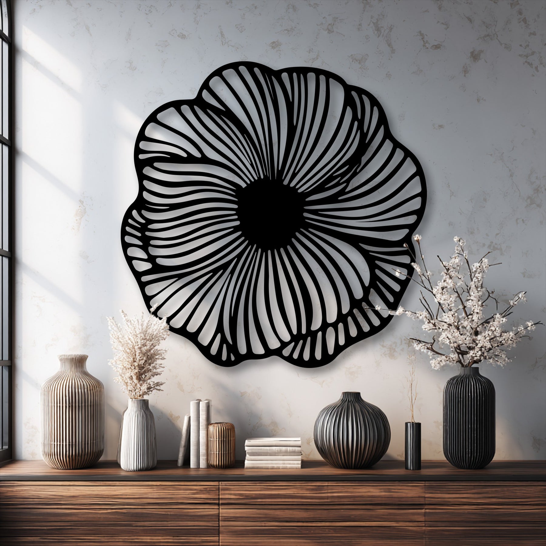Crafted from sleek black metal, the precision-cut design allows light to pass through, casting delicate shadows that enhance depth and dimension. The result is a refined and elegant wall accent that shifts subtly with changing light throughout the day.