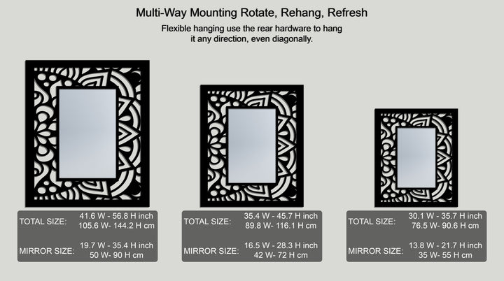 This abstract mandala frame metal floor mirror combines flowing organic shapes with structured geometric symmetry. The central rectangular mirror is framed by a bold black metal border, while the surrounding cut-out patterns form a dynamic mandala-inspired composition.