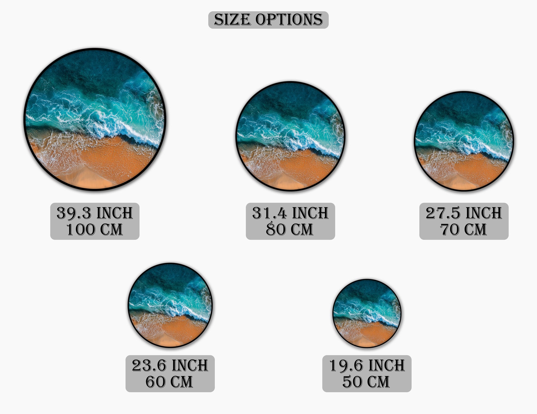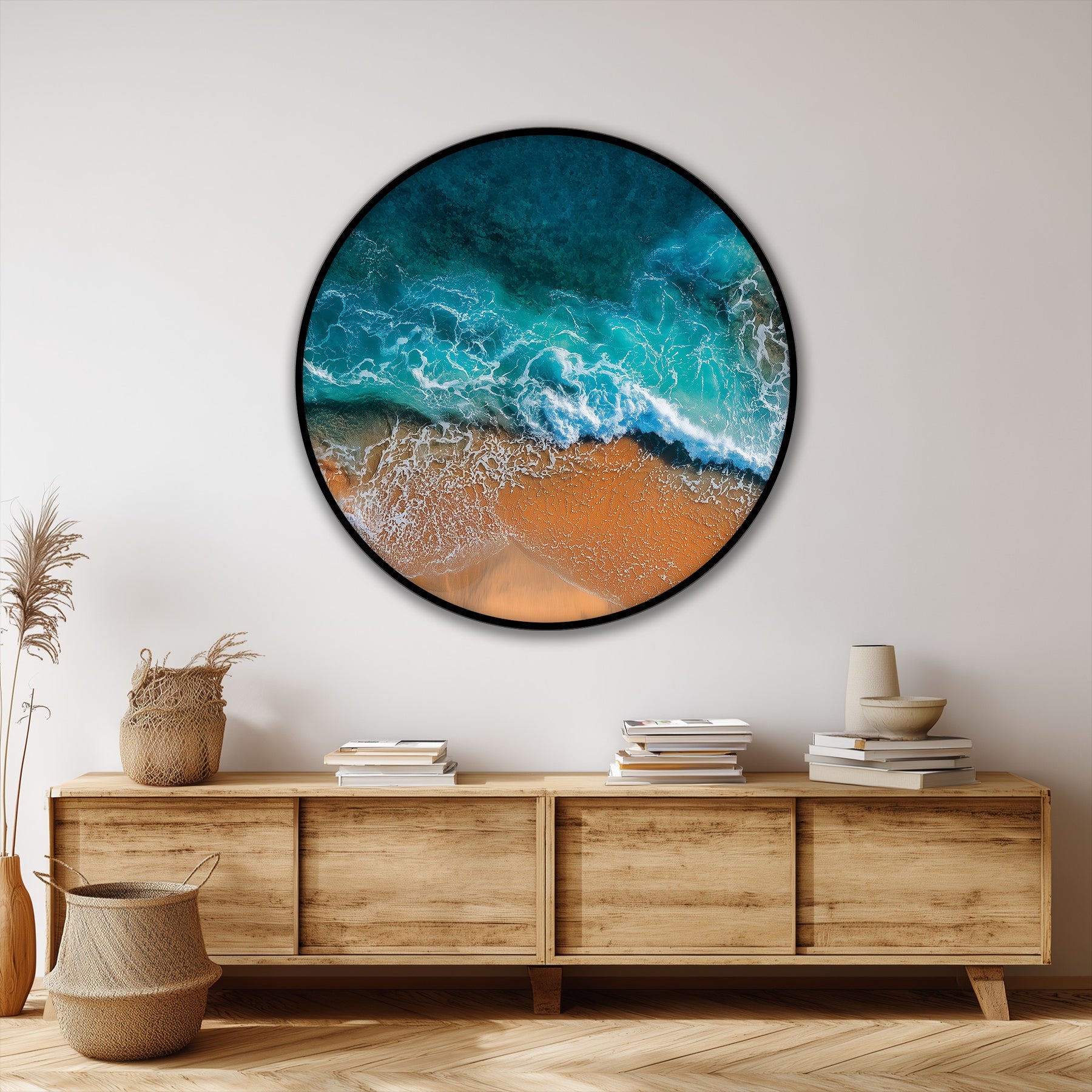 Bring the refreshing energy of the seaside into your home with this stunning round canvas print. Capturing an aerial view of turquoise waves gently crashing onto golden sand, this artwork blends vibrant ocean hues with warm coastal tones. The natural motion of the water and delicate foam details create a dynamic yet calming composition that instantly evokes the feeling of a peaceful beach escape.