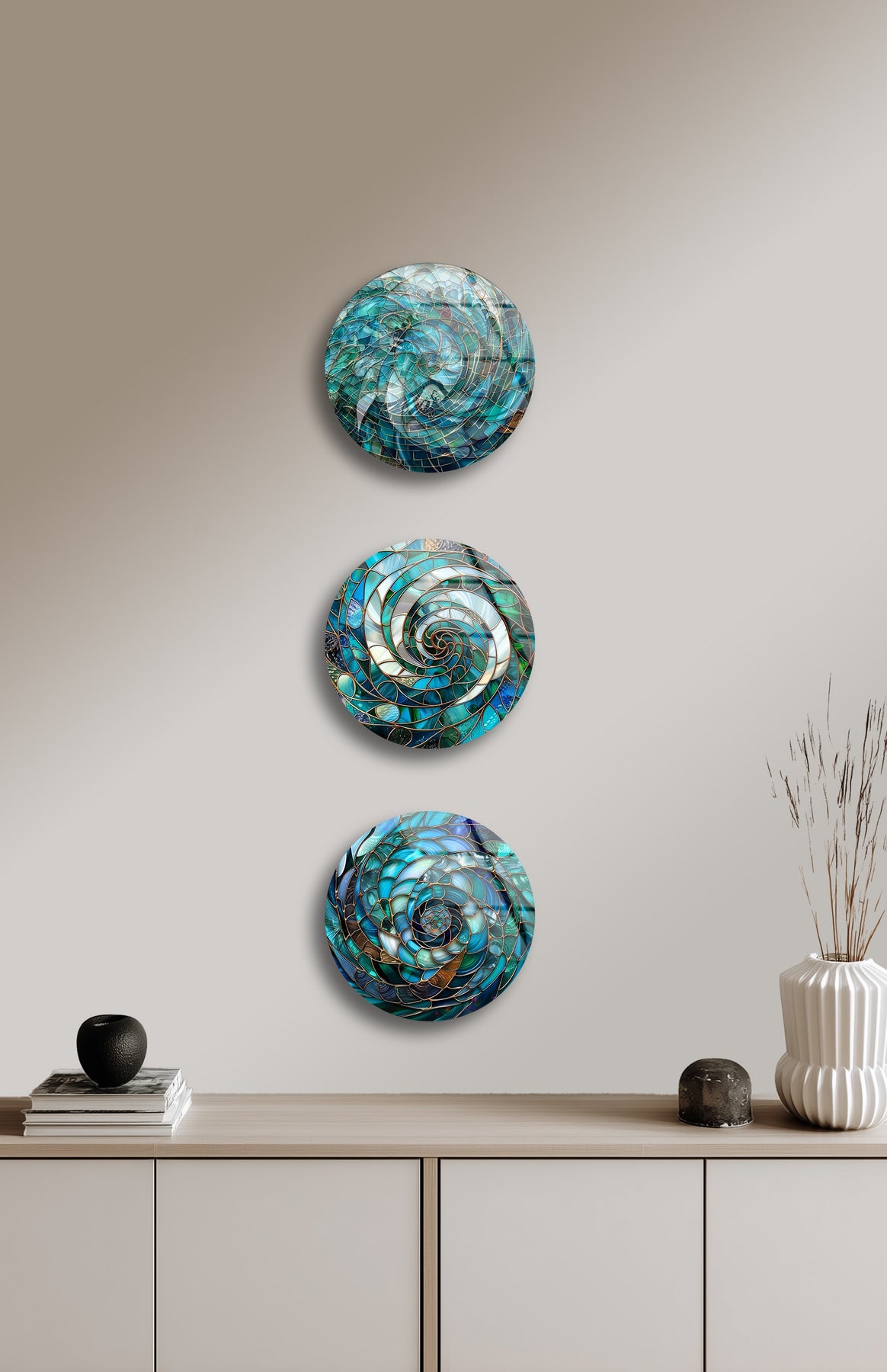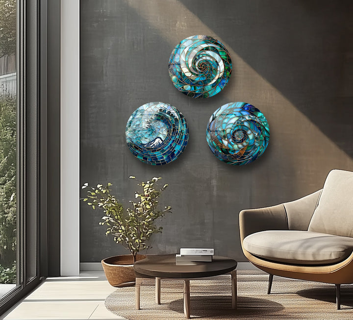 Immerse your space in the tranquil energy of the sea with the Aqua Spiral Essence – Abstract Ocean Mosaic Round Glass Wall Art Set. This stunning trio of glass artworks features intricate spiral designs inspired by ocean waves, shells, and the natural rhythm of water. The swirling patterns of turquoise, emerald, and ivory create a soothing yet captivating focal point that reflects both nature’s harmony and artistic precision.