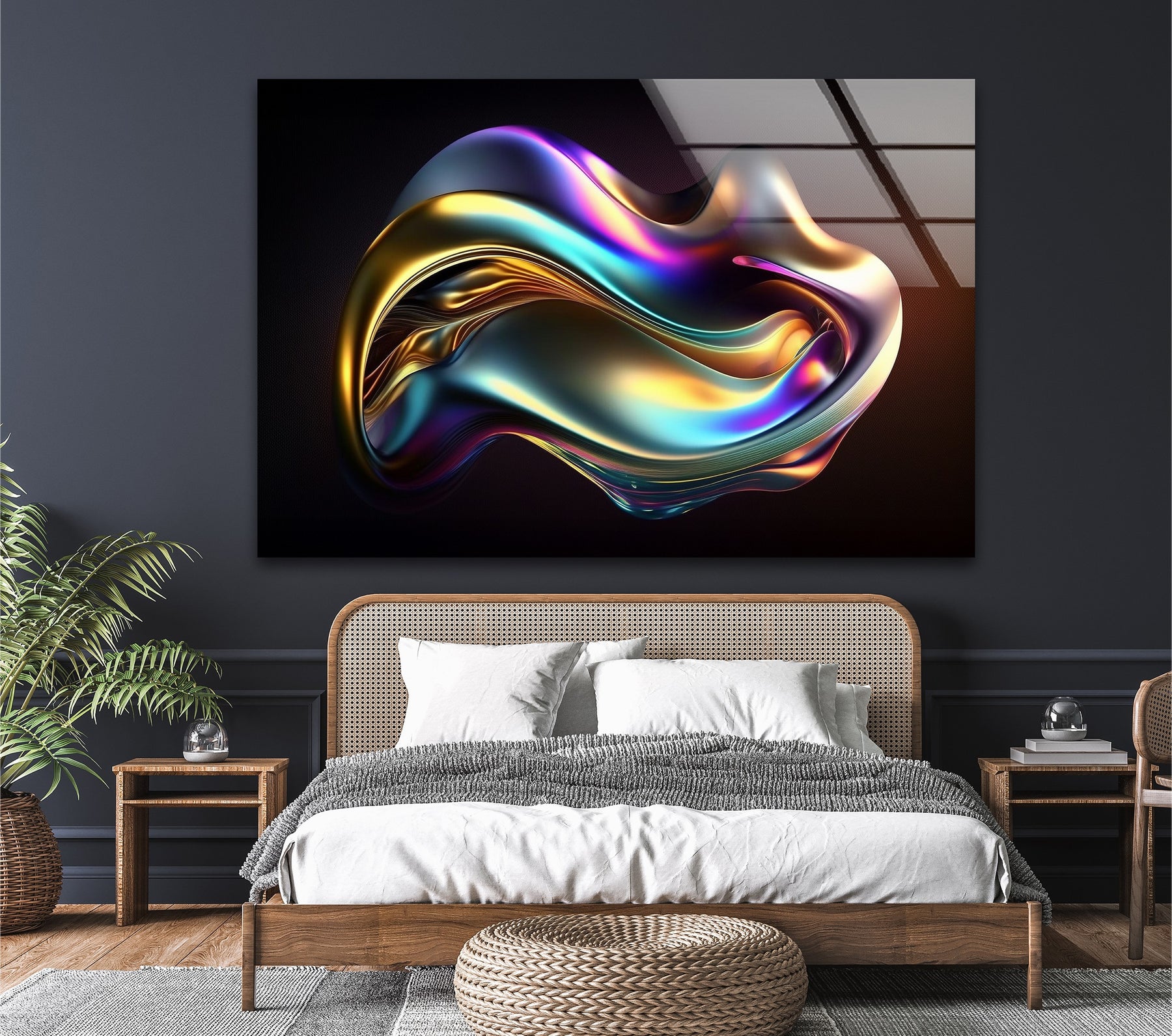 Transform your space with the luminous beauty of Aurora Chrome Wave – Iridescent Metallic Flow Glass Wall Art. This breathtaking artwork features a flowing chrome wave illuminated with vibrant hues of gold, teal, violet, magenta, turquoise, and electric blue. The smooth, mirror-like surface creates a hypnotic sense of motion—perfect for modern interiors that embrace bold color, futuristic aesthetics, and artistic expression.