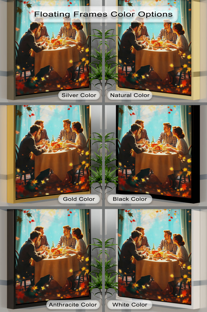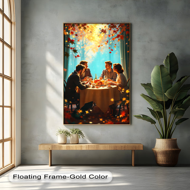 Embrace the warmth of friendship and gratitude with Autumn Gathering Glow, a cozy Thanksgiving canvas wall art that radiates the magic of fall celebrations. A golden autumn light pours through the trees, casting a soft glow over a joyful table set with pumpkins, fruits, and wine. Surrounded by laughter and conversation, this heartwarming artwork captures the true essence of togetherness and seasonal charm.