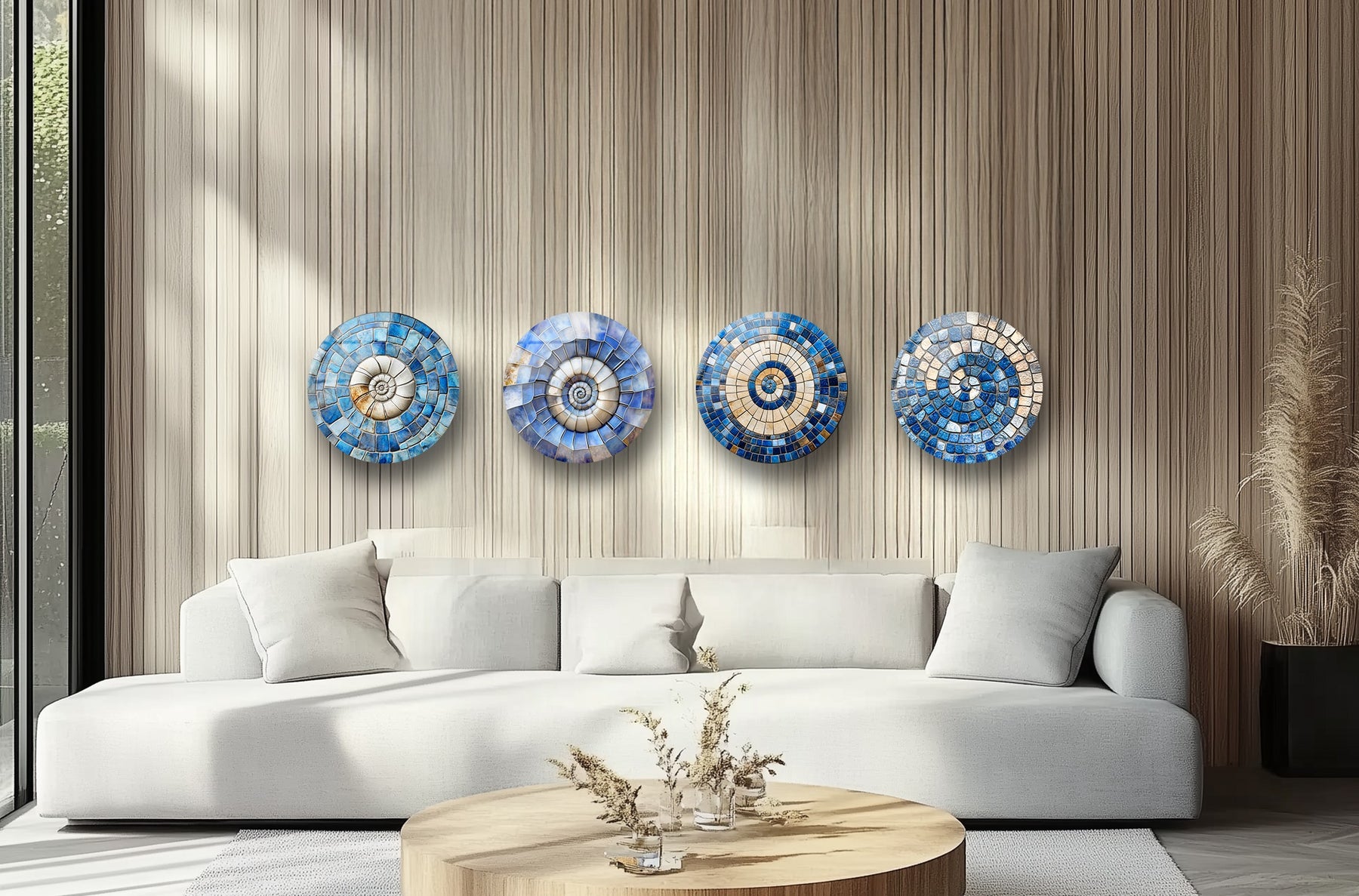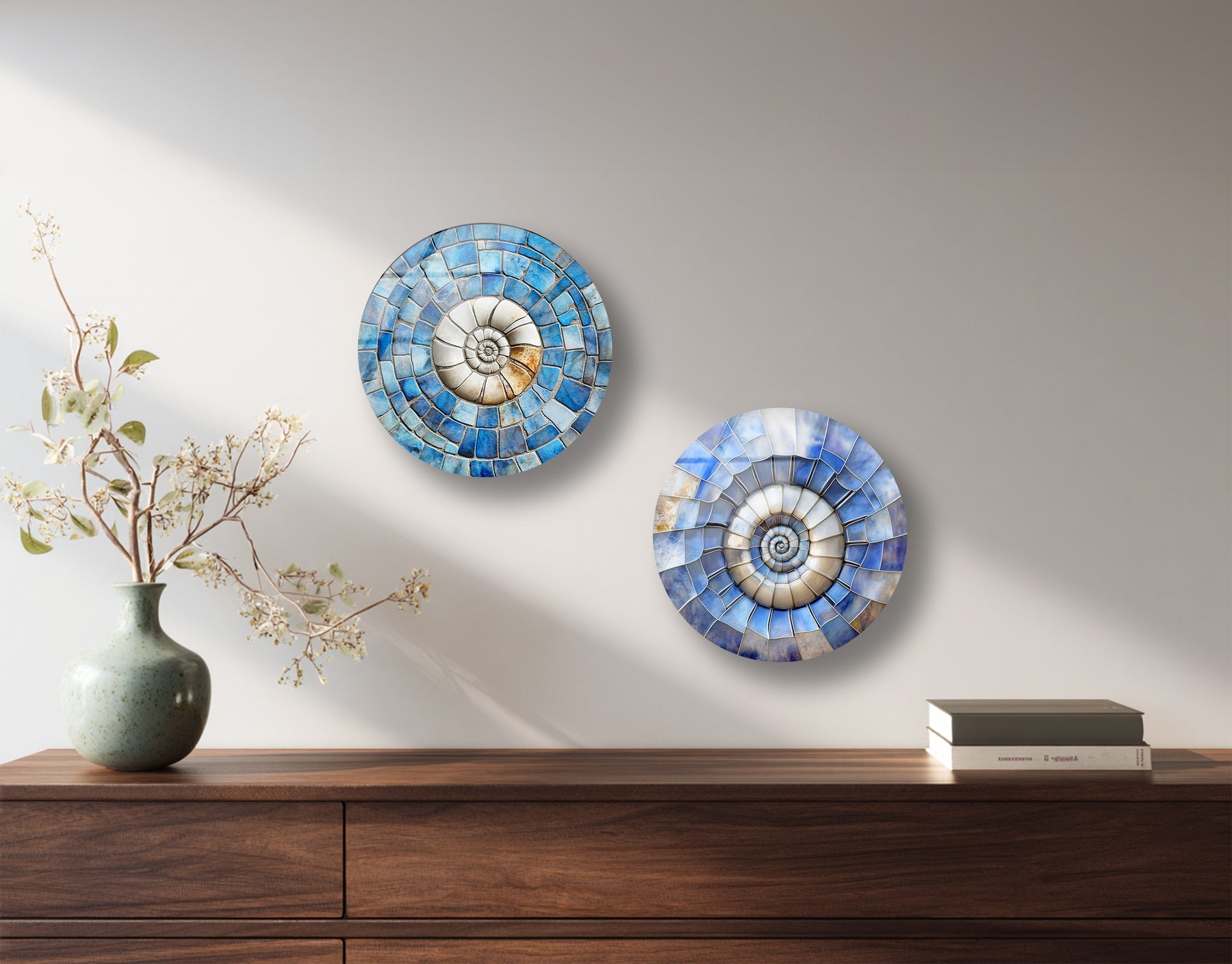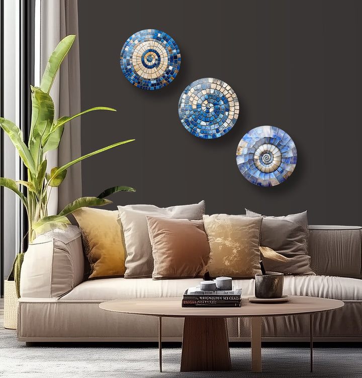 Experience tranquility and movement combined with the Azure Spiral Harmony – Blue Mosaic Round Glass Wall Art Set. This sophisticated trio features elegant spiral patterns in soothing shades of ocean blue, sand beige, and pearly white — symbolizing flow, eternity, and calm balance.
